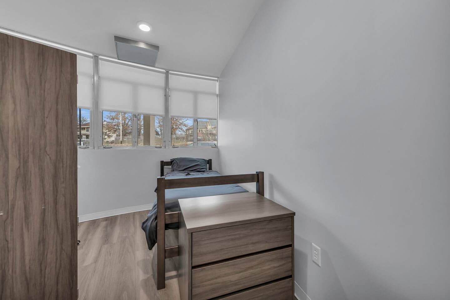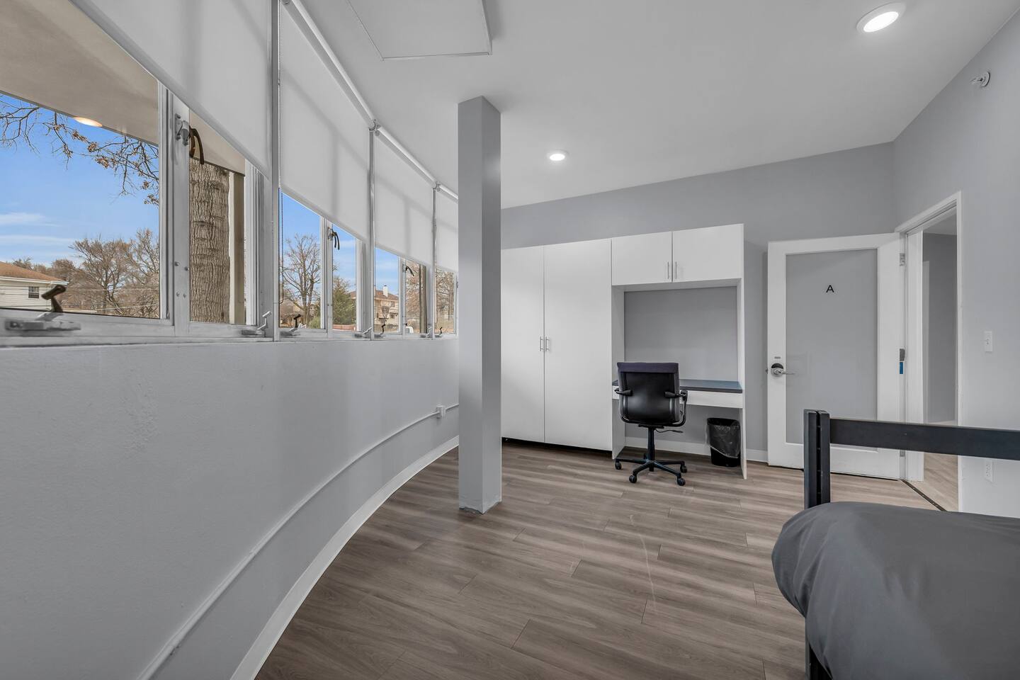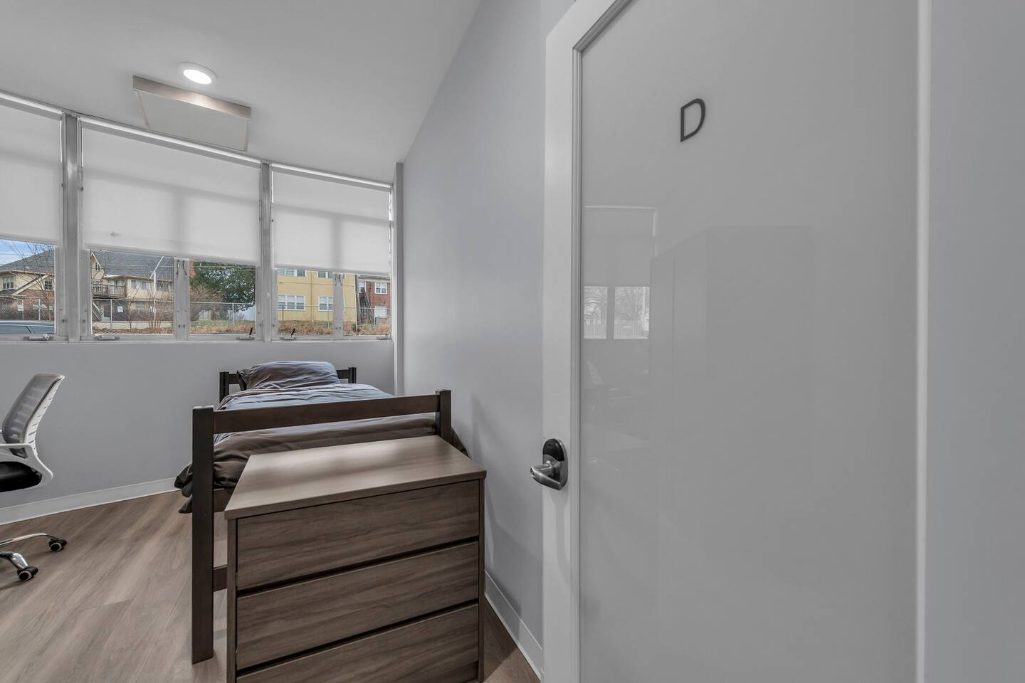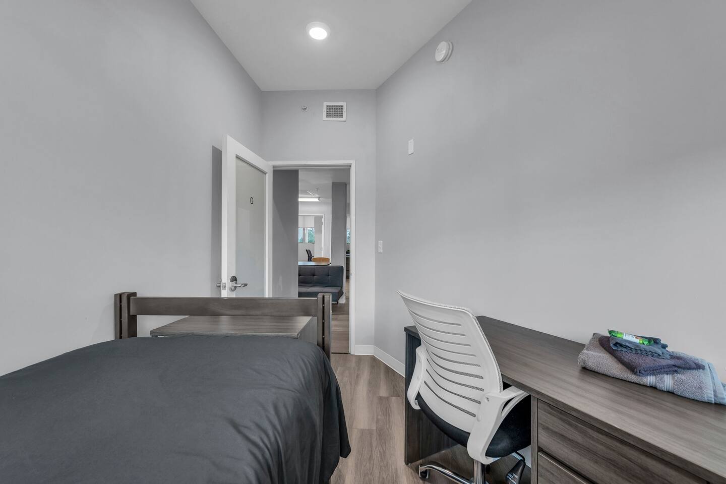 ✅Location: Perfect for students, traveling nurses, & professionals, situated between Rockhurst University (across the street) and UMKC (2 blocks away). ✅Bedrooms: 8 spacious rooms, each with a twin bed. This pod can accommodate 1 guest per room for a total of up to 8 guests for this pod. ✅Work/Study spaces: Each room includes dedicated work/study areas. ✅Bathroom: communal-style bathroom with multiple stalls, shower area, and bathroom sink. ✅Kitchenette: The pod has a microwave, minifridge, and a coffeemaker. ✅Parking: Free open parking within the building complex right in front of the building. Not covered and unnumbered. ✅Shared Spaces: Includes a communal living area and a fully equipped shared kitchen with a stove, oven, and washer and dryer. ✅Shared Communal Restroom in the building: It features 2 shower stalls, 3 toilet stalls, and 3 sinks. ✅Ideal For Student-friendly living, study environment, traveling nurses, and professionals.