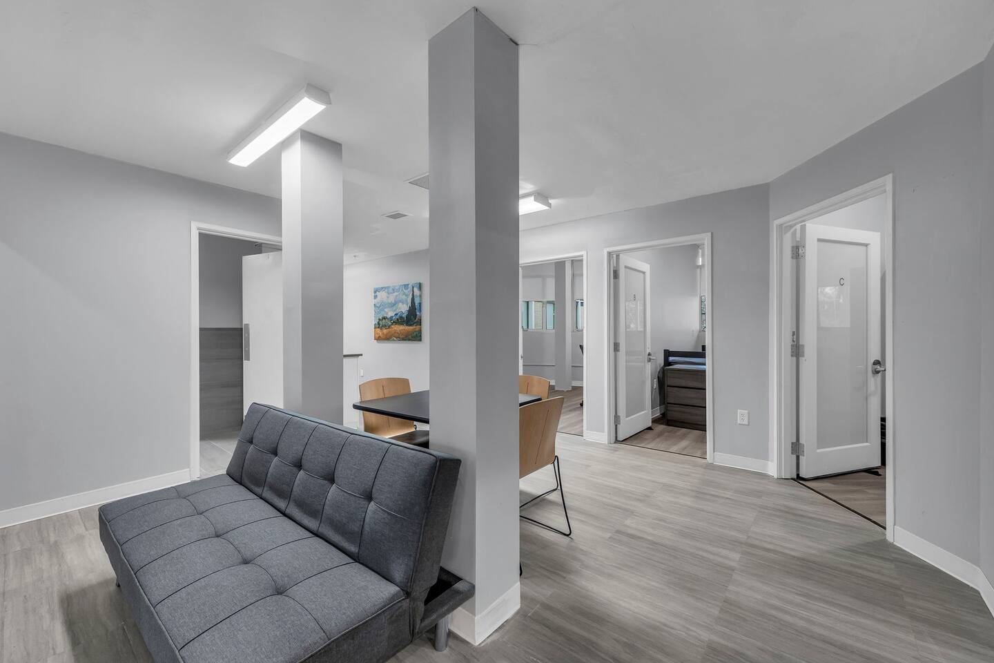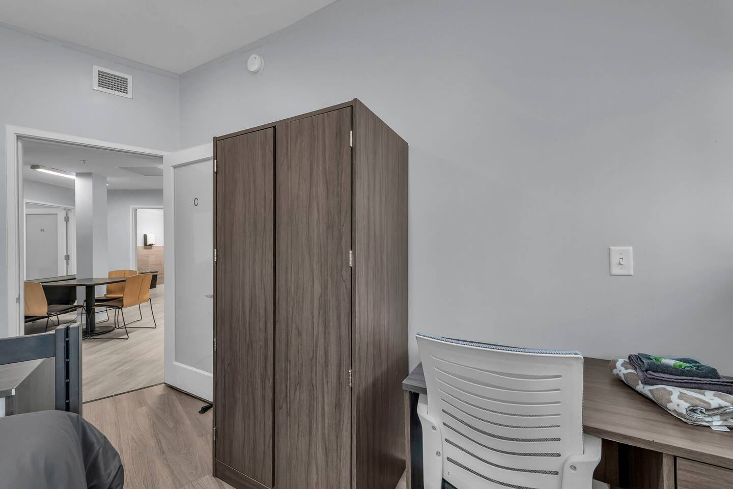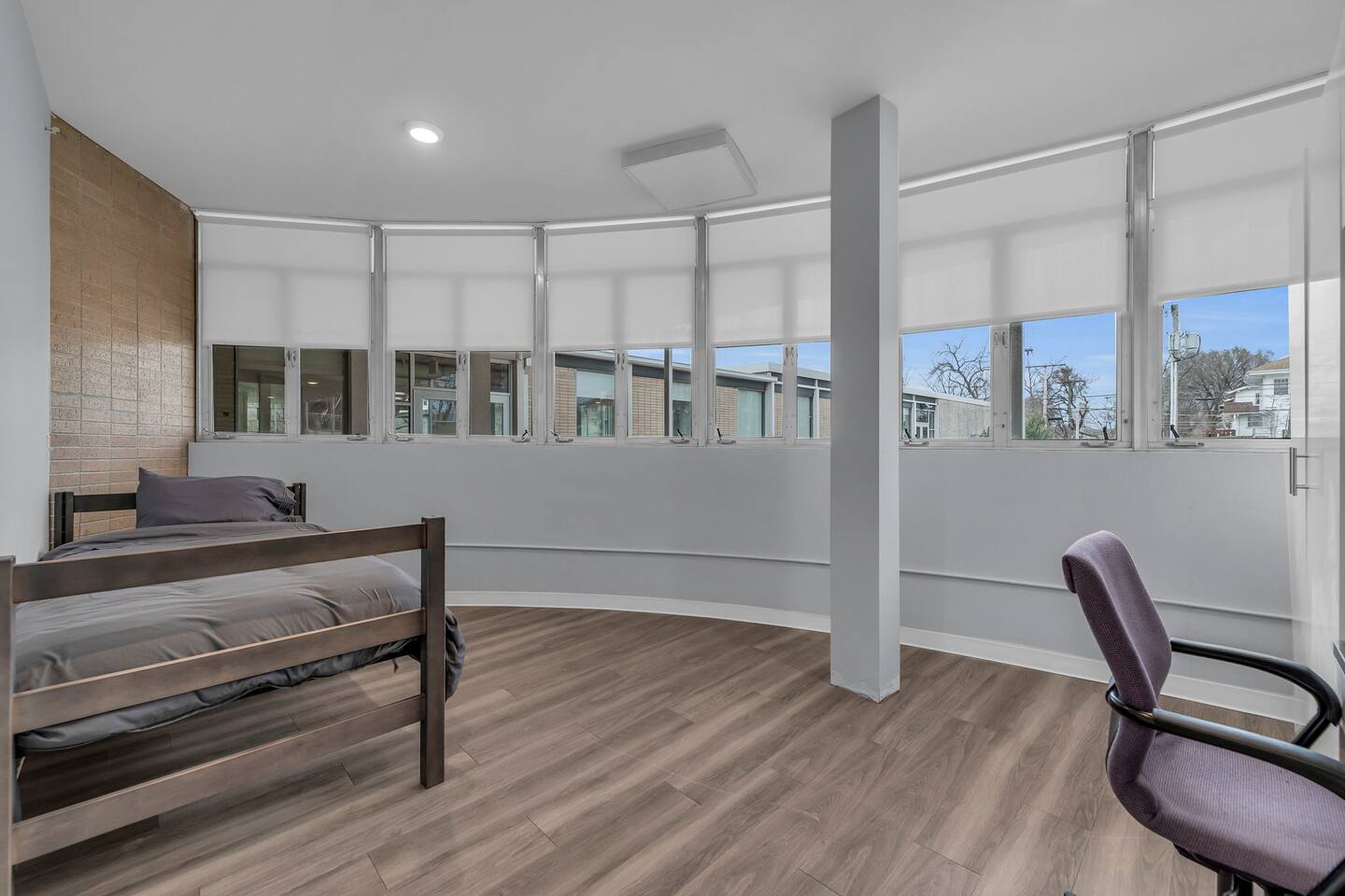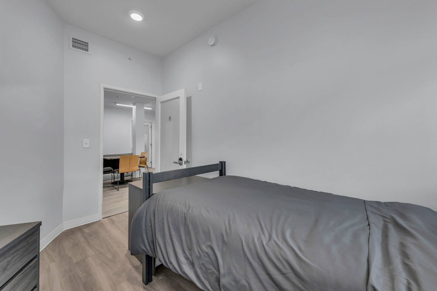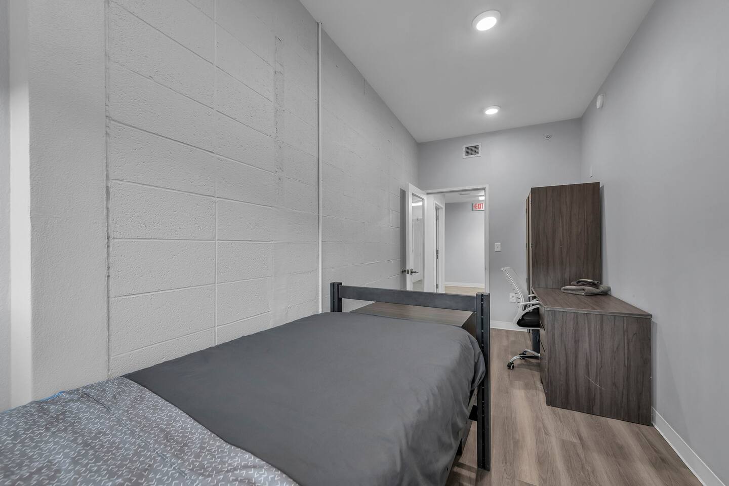 ✅Location: Perfect for students, traveling nurses, & professionals, situated between Rockhurst University (across the street) and UMKC (2 blocks away). ✅Bedrooms: 8 spacious rooms, each with a twin bed. This pod can accommodate 1 guest per room for a total of up to 8 guests for this pod. ✅Work/Study spaces: Each room includes dedicated work/study areas. ✅Bathroom: communal-style bathroom with multiple stalls, shower area, and bathroom sink. ✅Kitchenette: The pod has a microwave, minifridge, and a coffeemaker. ✅Parking: Free open parking within the building complex right in front of the building. Not covered and unnumbered. ✅Shared Spaces: Includes a communal living area and a fully equipped shared kitchen with a stove, oven, and washer and dryer. ✅Shared Communal Restroom in the building: It features 2 shower stalls, 3 toilet stalls, and 3 sinks. ✅Ideal For Student-friendly living, study environment, traveling nurses, and professionals.