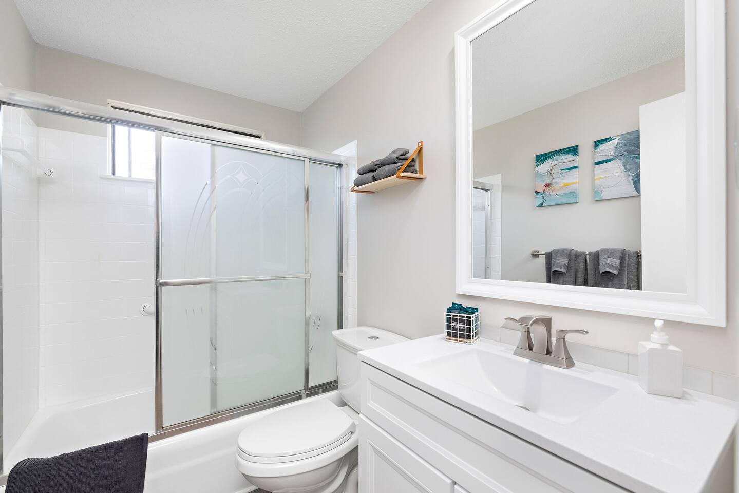 • 4 bedrooms, 2 bathroom • There is a 1 car garage with a driveway fits at least 3 cars • 50" Roku TV in the living area and two 40" Roku TV in each king bedroom • Master bedroom has king size bed (sleeps 2 guests) and there's another king bedroom (sleeps 2 guests too) • The other 2 bedrooms have queen size beds that sleeps 2 guests each • Living area has a 2 couches and a 50" Roku TV • One of the coaches in the living area, the gray one can be turned to a full sofa bed (sleeps 2 guests).
