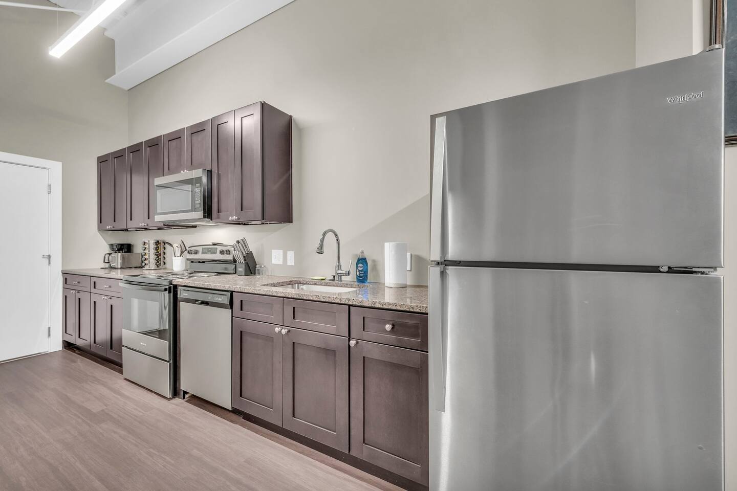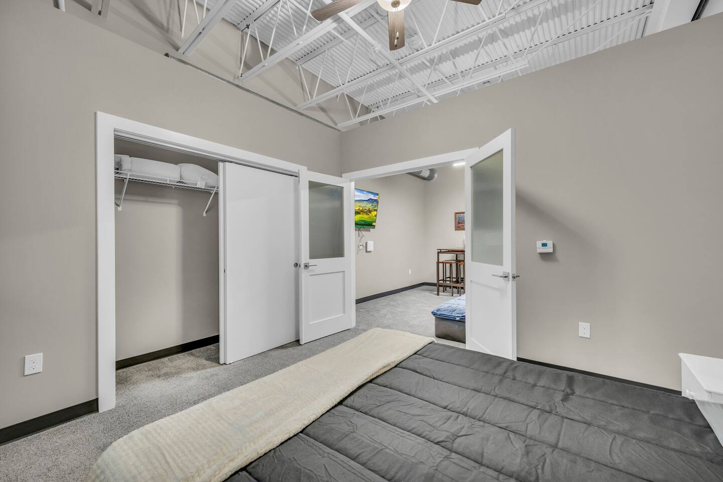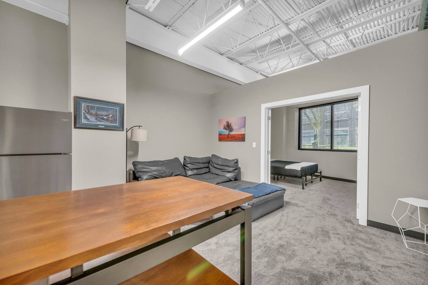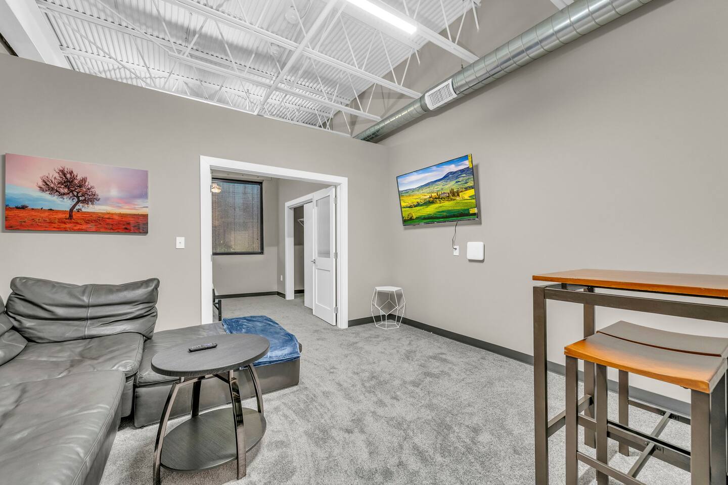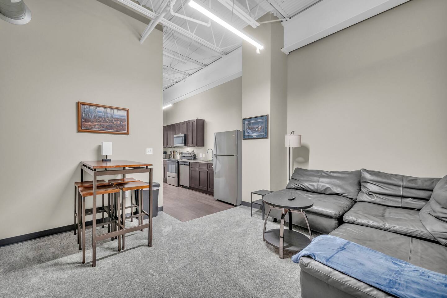 Welcome to our sleek and stylish loft, perfectly situated just minutes from the airport. This contemporary space is designed for comfort and convenience, featuring 1 bedroom with a cozy queen bed. The open-concept layout seamlessly integrates the living area, dining space, and a fully equipped kitchen, making it ideal for up to 2 guests. The living area boasts a flat screen TV for your entertainment, while the dining area includes 4 stools for comfortable meals. You'll appreciate the convenience of having your own washer and dryer, ensuring a hassle-free stay. Centrally located, this loft offers easy access to local attractions and amenities, making it the perfect choice for both short and extended stays. Enjoy modern living with high-speed WiFi and all the comforts of home in this beautifully designed space. Book our place now! Just a quick heads-up that the parking spots right in front of the property are reserved for loading, unloading, and for future residents. To keep things easy for everyone, please use the large parking lot instead.