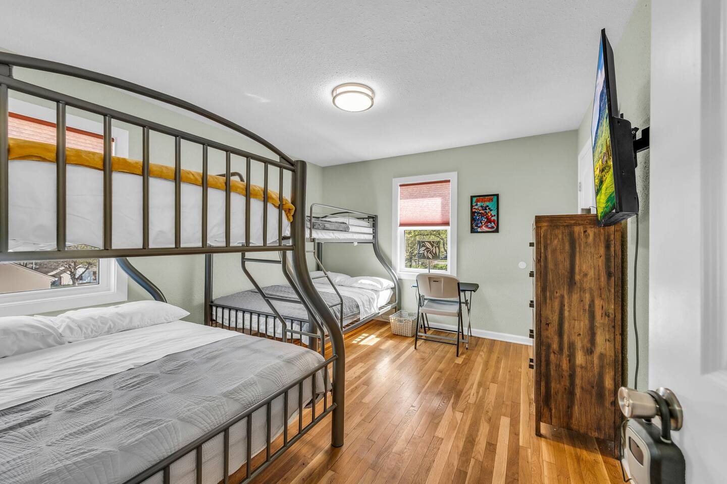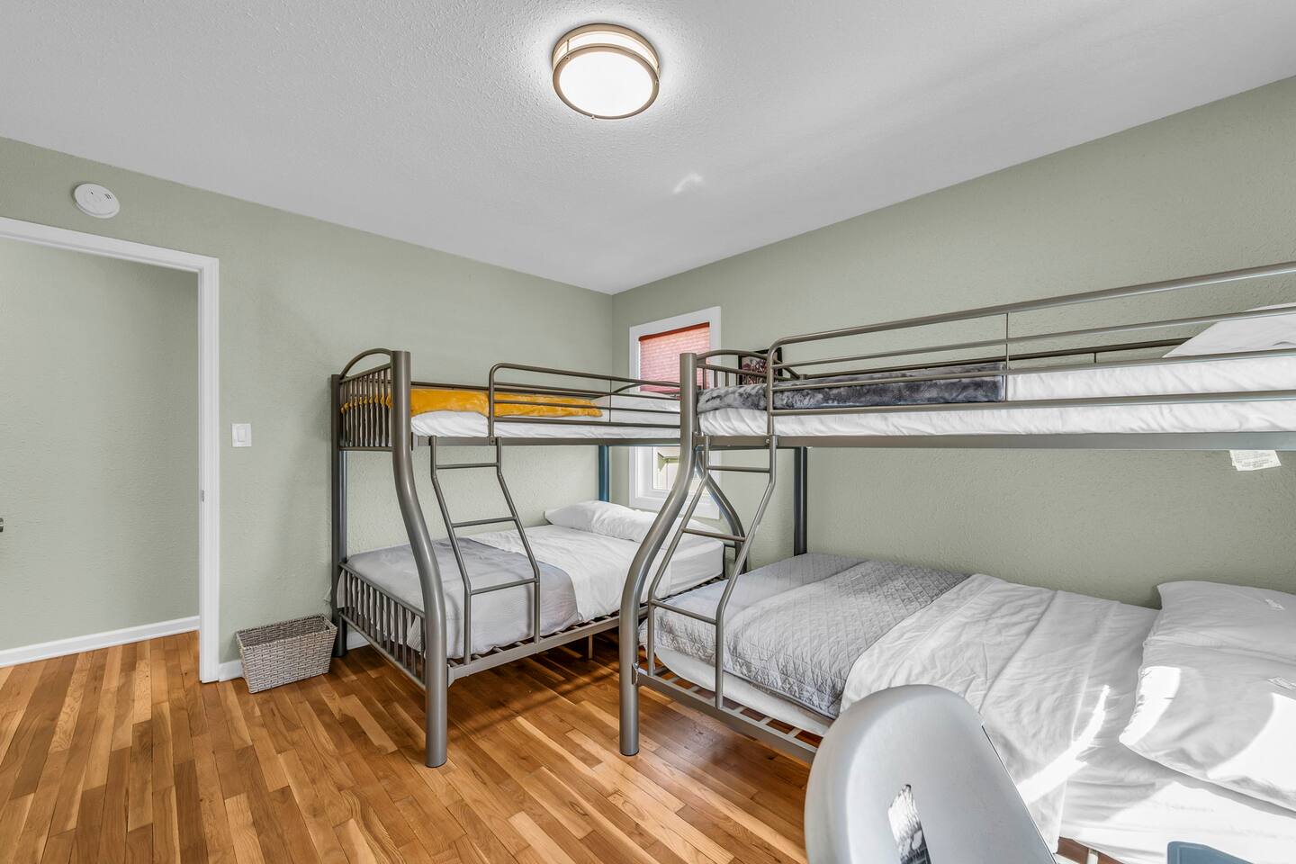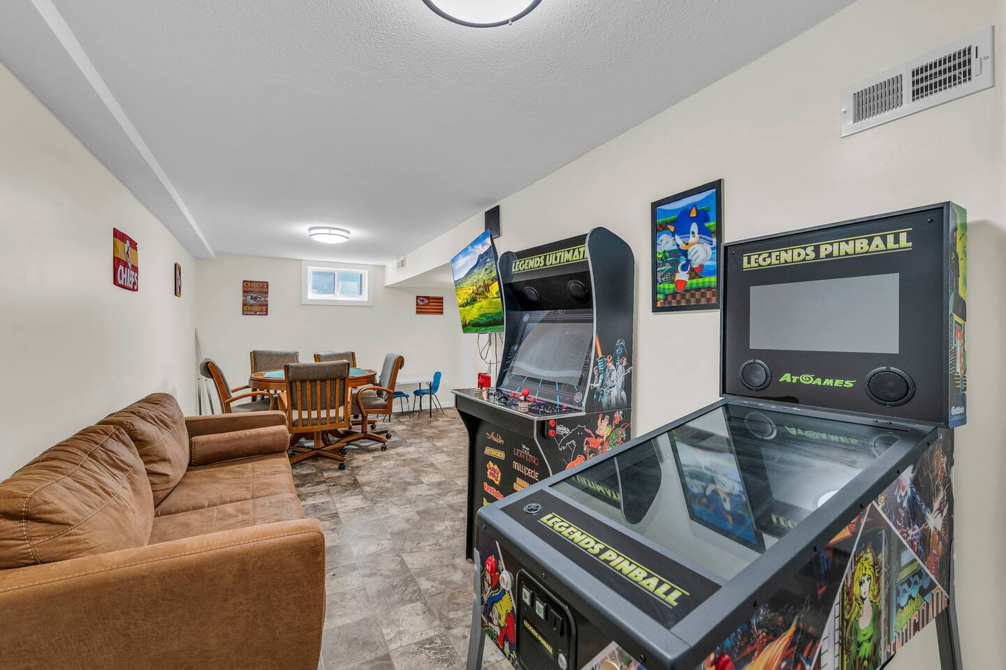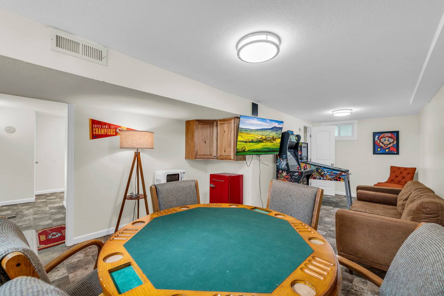Main Level Bedroom: 1 Queen bed with easy access to the kitchen and guest bath. Upstairs: 1 King bedroom (left at the top of the stairs) 1 Queen bedroom (north-facing) 1 Bunk room with two bunk beds (Full on the bottom, Twin on top – sleeps up to 6!) 🛁 Bathrooms: 2 full baths: One upstairs and one downstairs, both with a shower and tub combo. 🎲 Epic Game Room & Entertainment: Head downstairs to your full basement hangout spot featuring: 2 Arcade Machines Board games for all ages Flat-screen TV Mini-fridge & microwave — perfect for movie snacks or poker night treats! 🧺 Laundry Room Perks: TWO washers + TWO dryers — ideal for groups and long stays. 🌳 Outdoor Living: Spacious fenced backyard perfect for pets Relaxing hot tub BBQ grill on the back porch with outdoor dining space 🚗 Parking: Driveway fits multiple vehicles Garage was converted into a game room 🐾 Pet-Friendly: Bring your furry friends! The yard is fenced and safe for pets to roam. 📍 Location Highlights: Nestled in a peaceful neighborhood, this home is just a short drive from local parks, shopping, and restaurants — but with everything you need under one roof, you may never want to leave. Book your stay now!