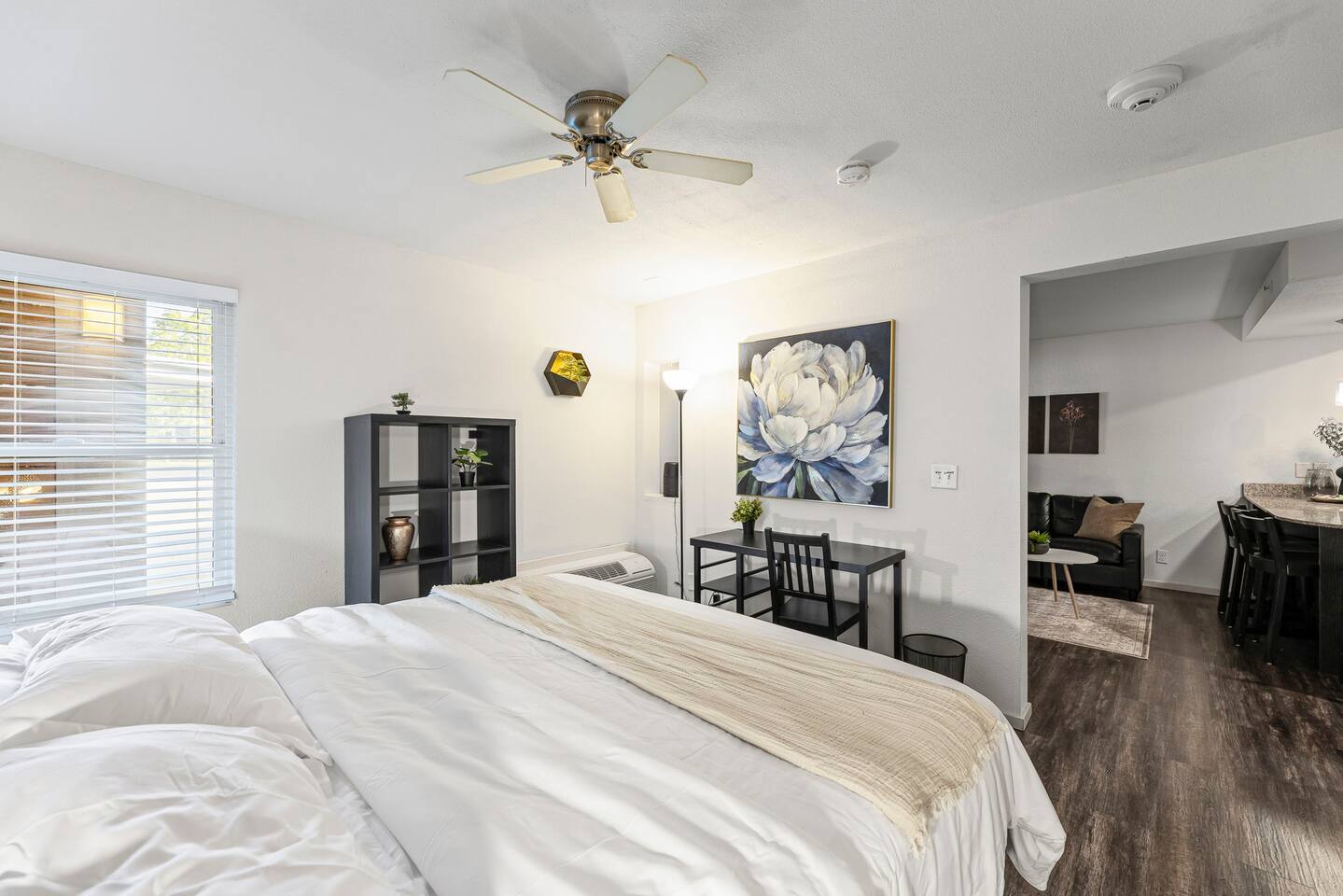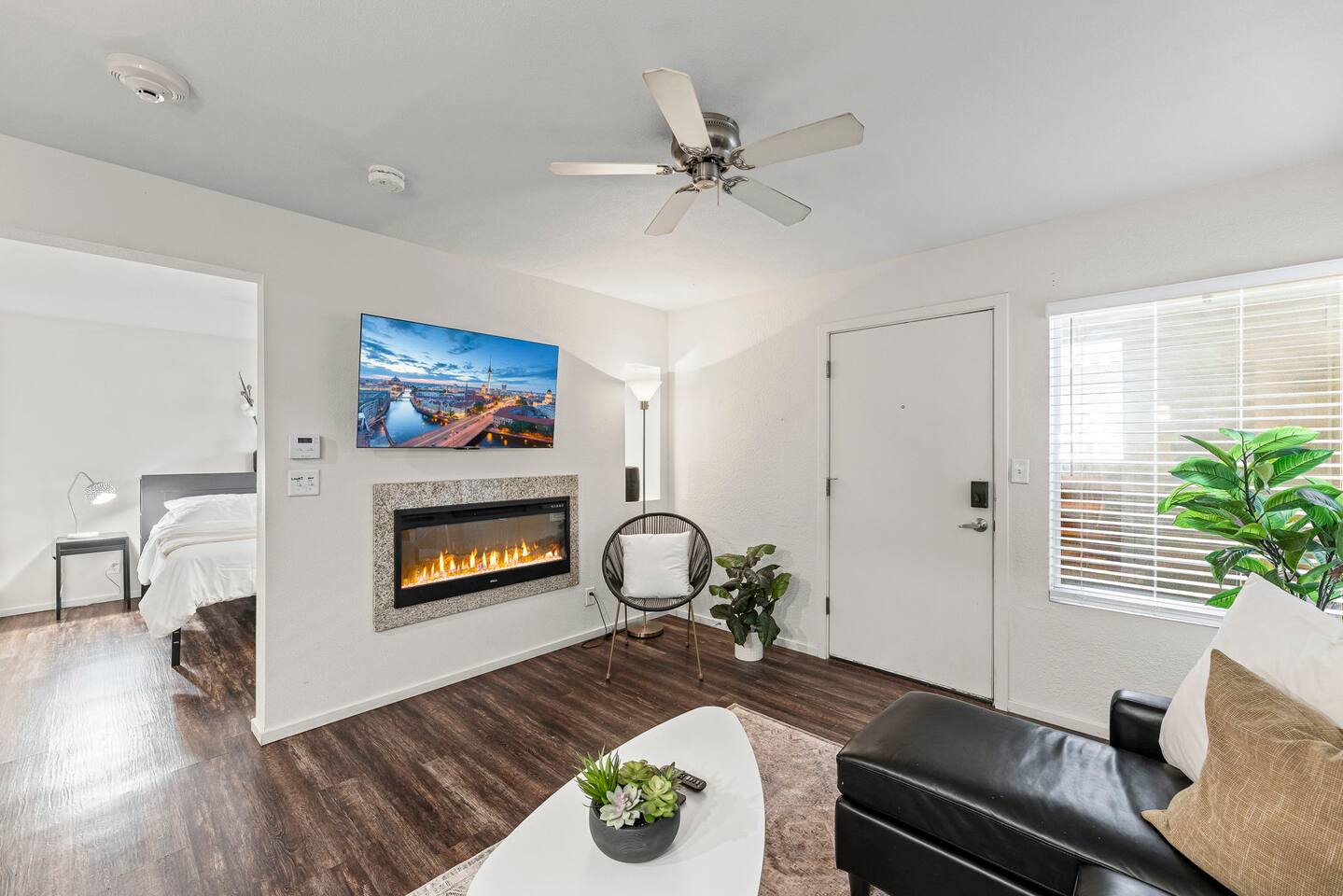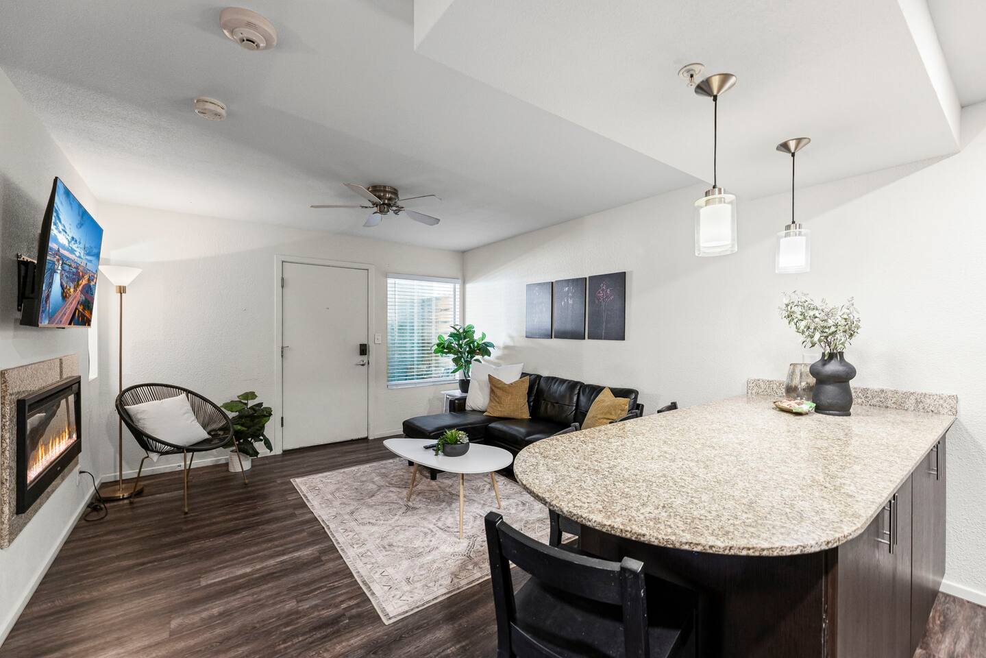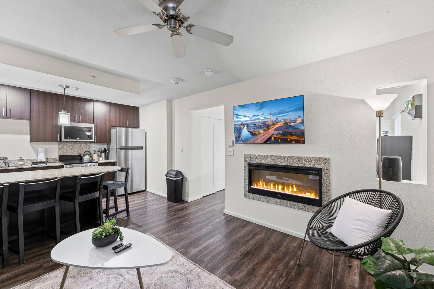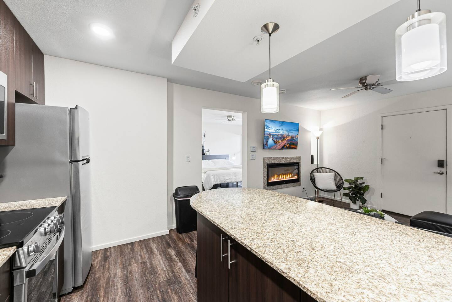Welcome to The Suite Spot, a modern 1BR retreat with private covered parking just steps from your door. Enjoy a cozy living area with a sleek electric fireplace, 55" Roku TV, a dedicated laptop workstation, and full kitchen with granite counters and stainless appliances. The plush king bed, workspace, and fast WiFi make it ideal for work or rest. Outside, enjoy the lounge w/ TV, BBQ grill, & sun chairs. Dog park & gym access too. Stylish, convenient, and peaceful—your perfect home base awaits!