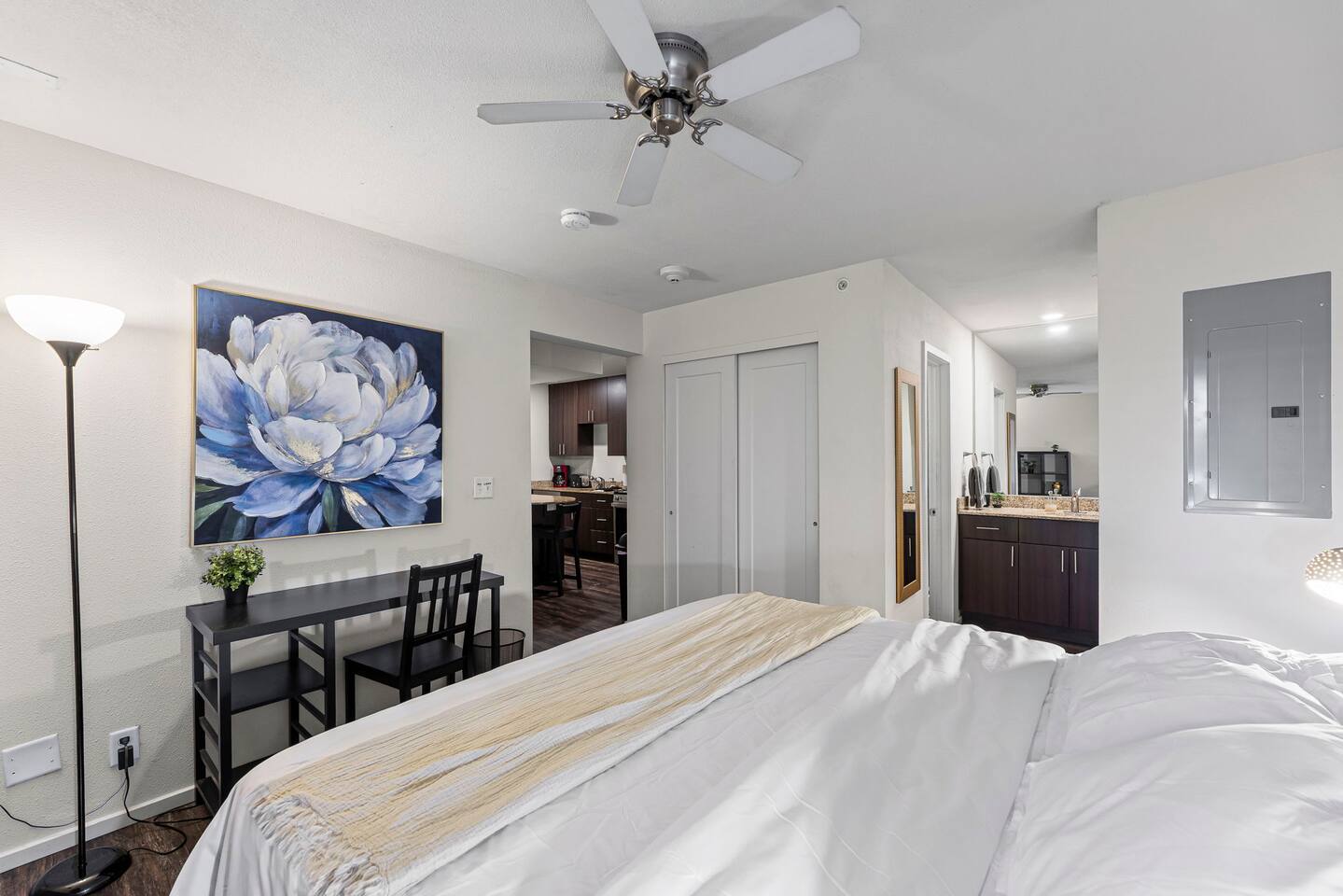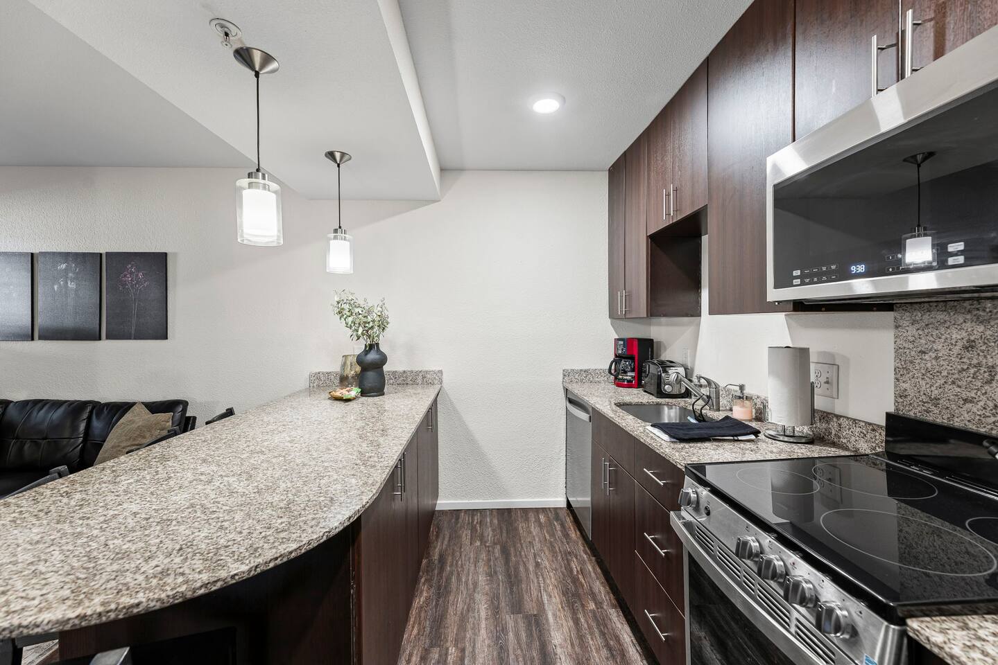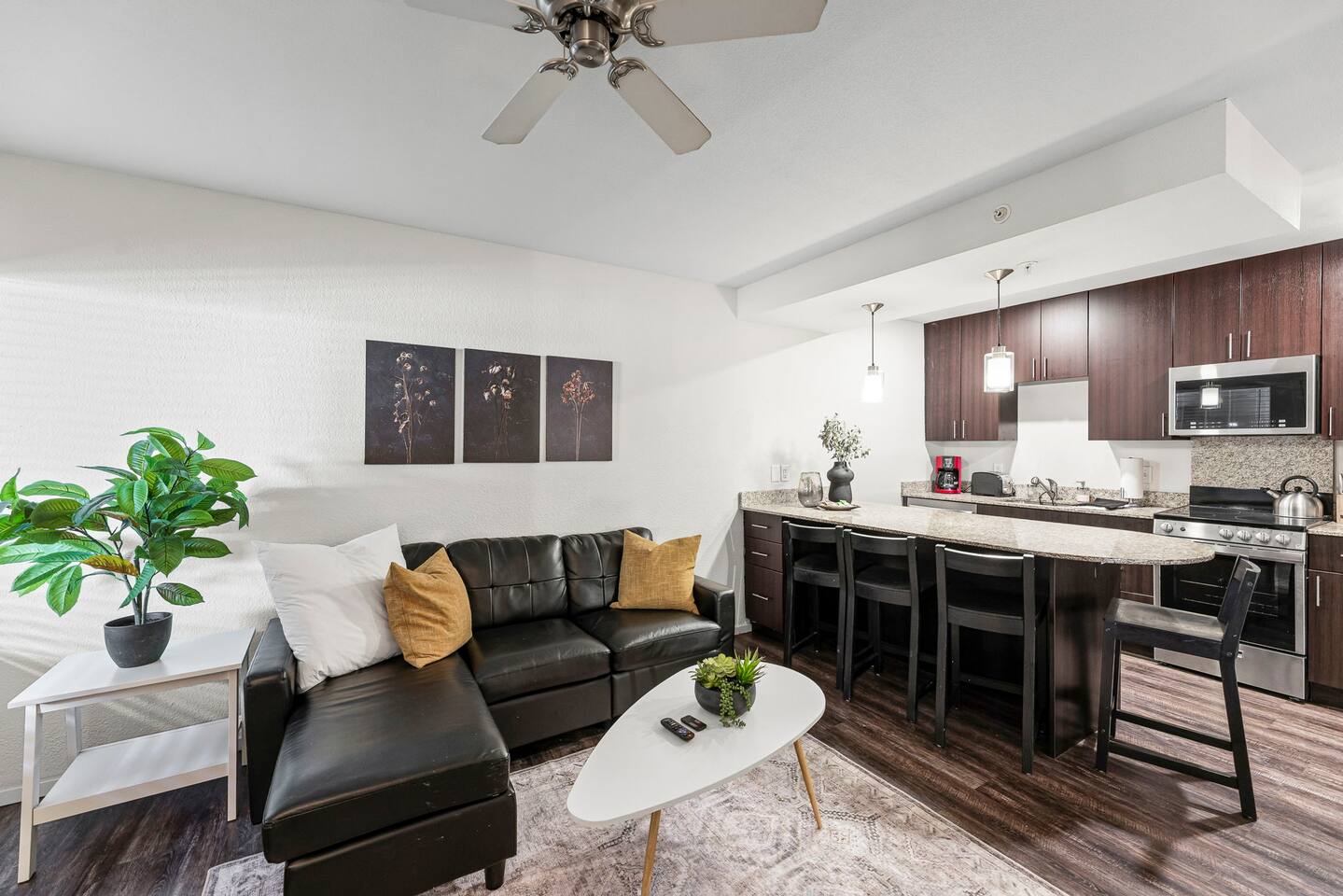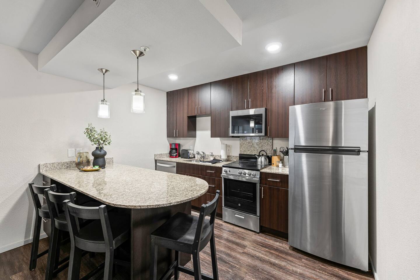 Welcome to The Suite Spot, a modern 1BR retreat with private covered parking just steps from your door. Enjoy a cozy living area with a sleek electric fireplace, 55" Roku TV, a dedicated laptop workstation, and full kitchen with granite counters and stainless appliances. The plush king bed, workspace, and fast WiFi make it ideal for work or rest. Outside, enjoy the lounge w/ TV, BBQ grill, & sun chairs. Dog park & gym access too. Stylish, convenient, and peaceful—your perfect home base awaits!