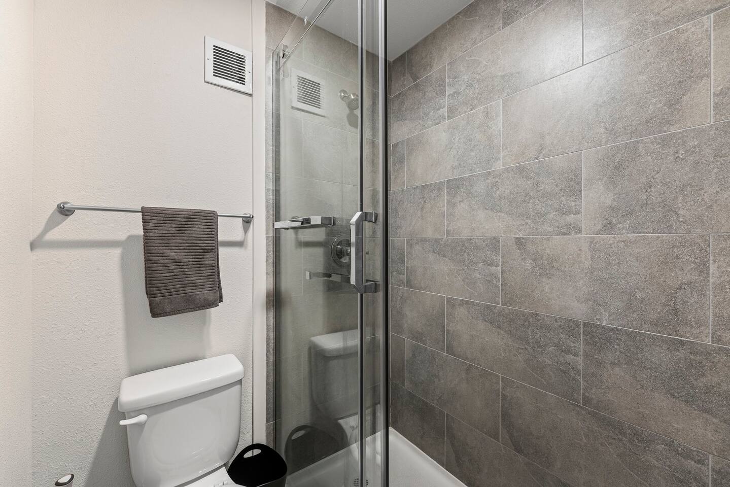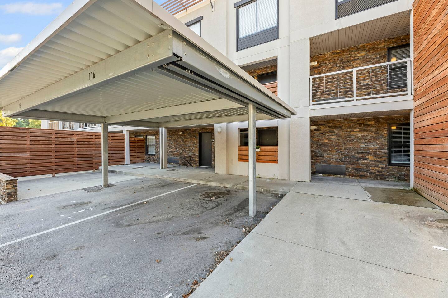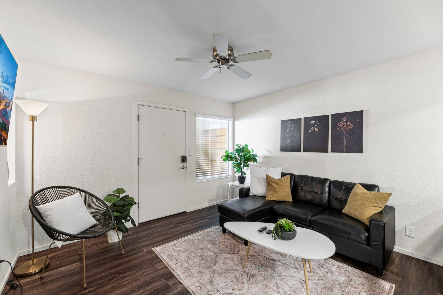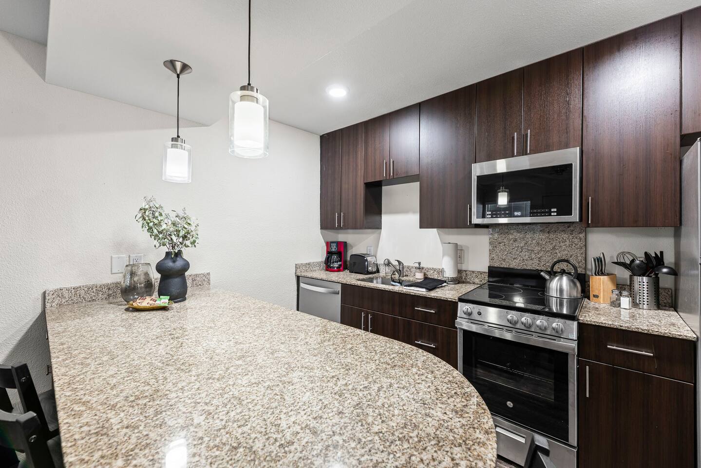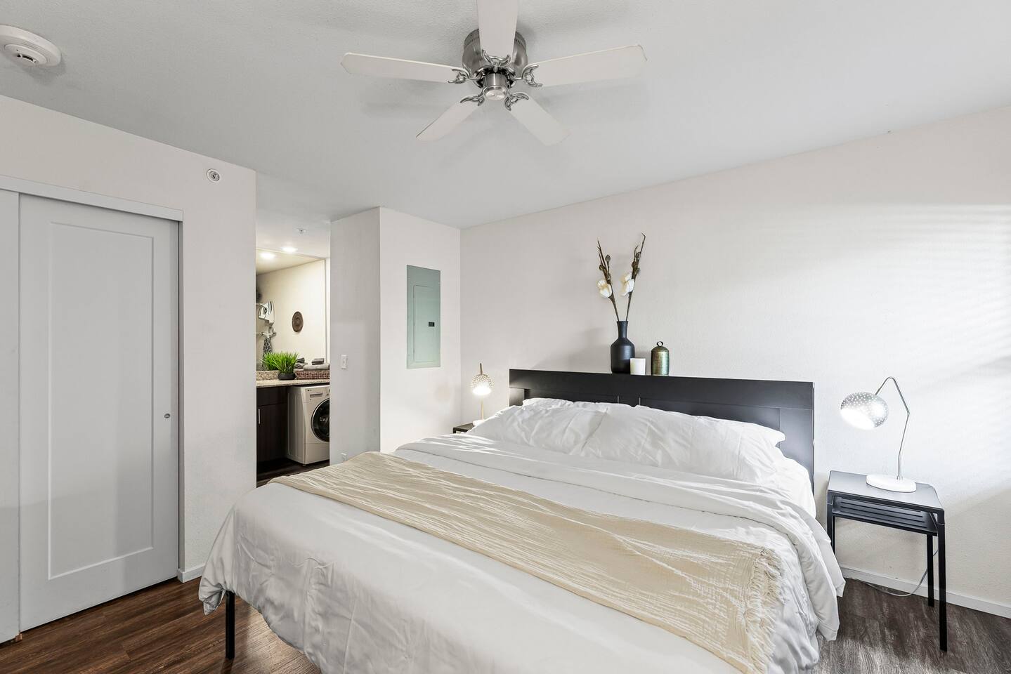 Welcome to The Suite Spot, a modern 1BR retreat with private covered parking just steps from your door. Enjoy a cozy living area with a sleek electric fireplace, 55" Roku TV, a dedicated laptop workstation, and full kitchen with granite counters and stainless appliances. The plush king bed, workspace, and fast WiFi make it ideal for work or rest. Outside, enjoy the lounge w/ TV, BBQ grill, & sun chairs. Dog park & gym access too. Stylish, convenient, and peaceful—your perfect home base awaits!
