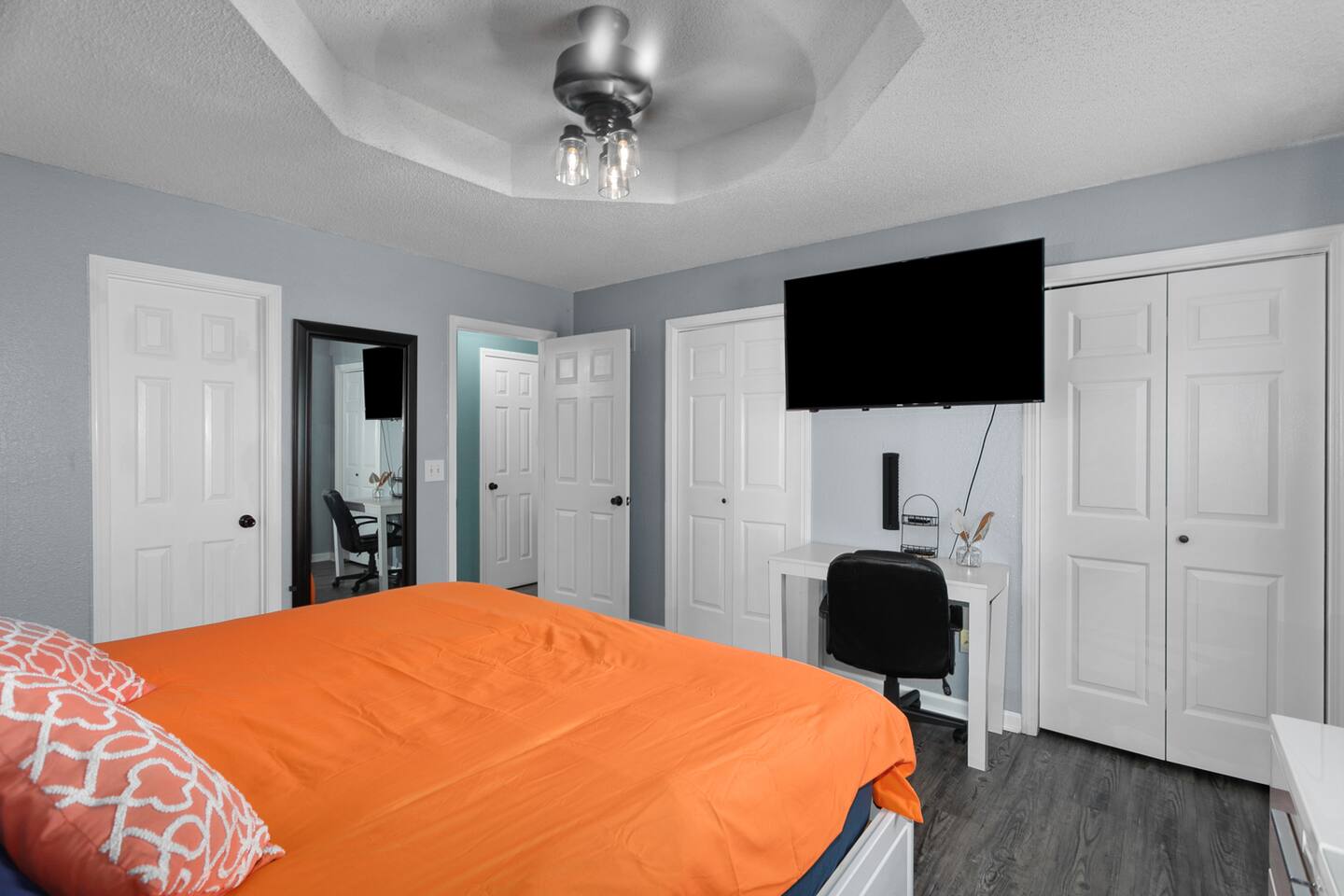 This house is equipped with 3 bedrooms, 2 bathrooms and an amazing living area with kitchen. First Bedroom has a King Bed, second and third bedrooms have queen size beds. In the living room, 2 sides of the L-shape are the same size and can be made to a twin bed that can sleep 2 more guests. Watch your favorite Netflix, HULU, or Amazon Prime on the smart ROKU TV's. (This listing does not have cable--and you'll have to login with your own credentials) The space is business ready with a small desk with laptop space, plenty of closet space, iron and ironing board, for all of your clothes needs! The space includes a washer/dryer, coffee maker (coffee, sugar and creamer provided) and a fully equipped kitchen complete with a toaster and blender. All basic toiletries provided--towels, soap, shampoo, conditioner, iron, board, coffee and tea. Super-fast WiFi and smart TVs. Traveling for business or just need a getaway, this is the house for you.