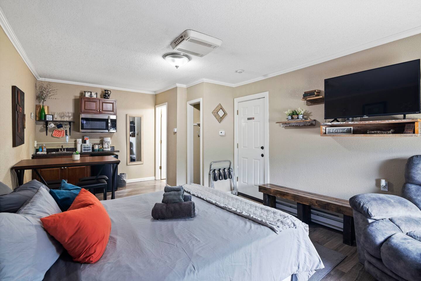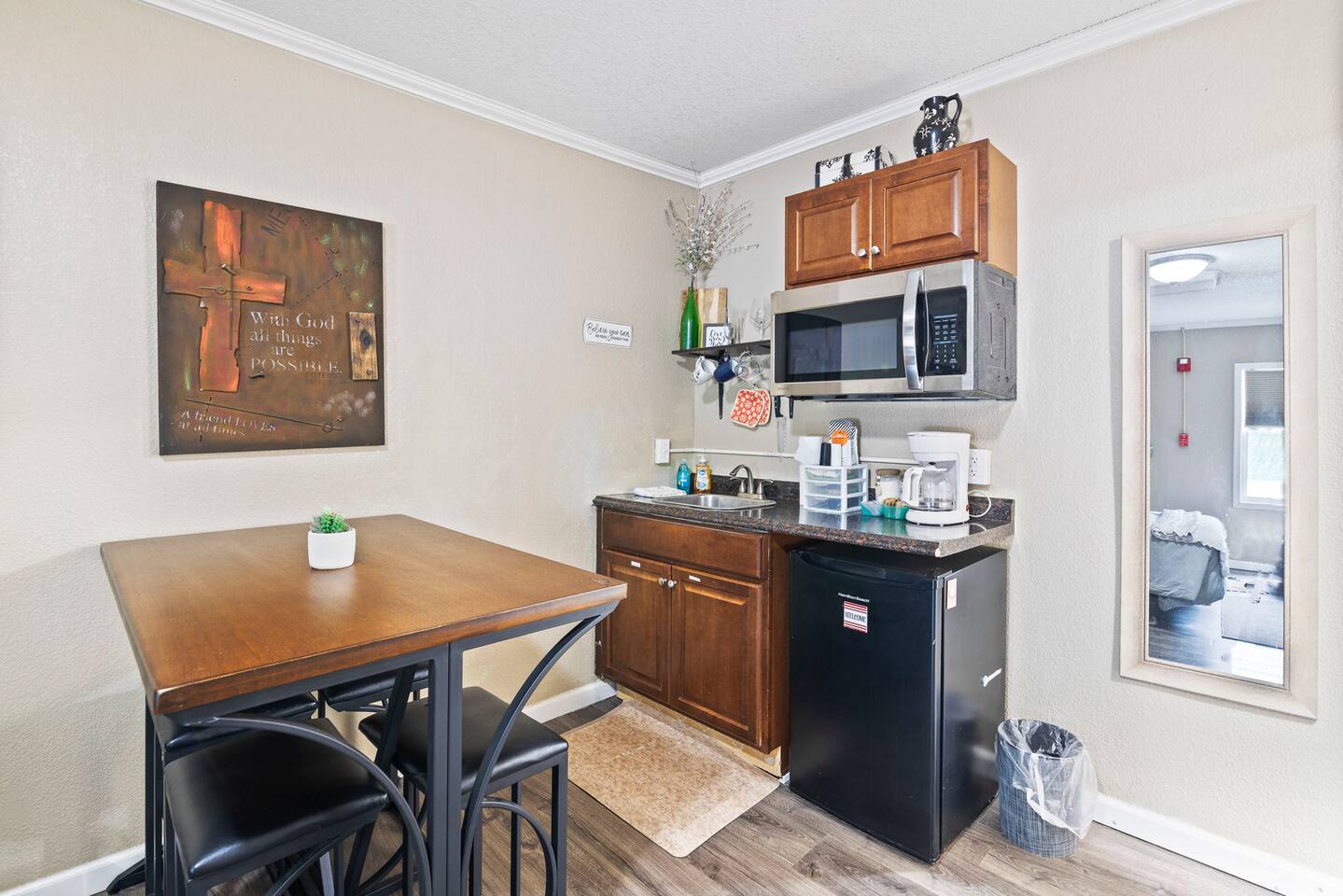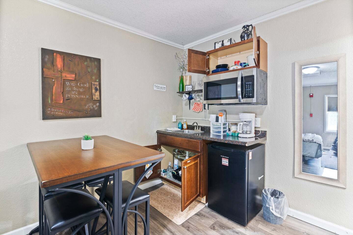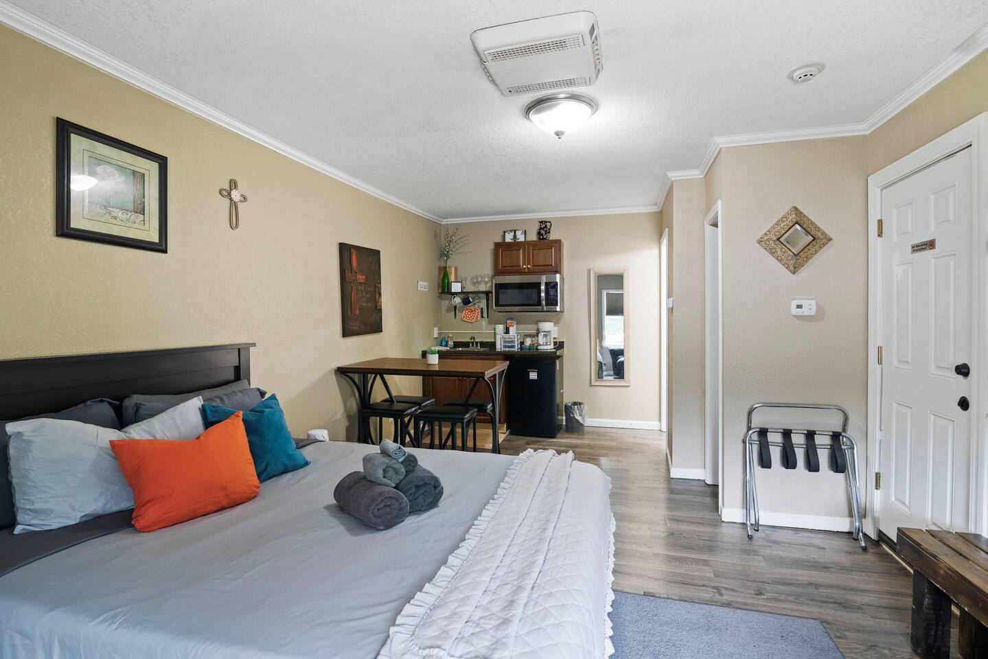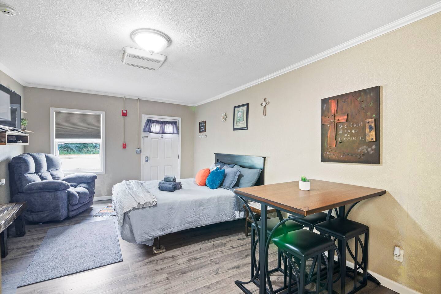 The property was originally built and functioned as a motel. Rooms were then renovated and turned into individual apartments. This particular apartment is a studio room with a queen-size bed, dining area, kitchenette, closet, and bathroom with a shower. There is a door that leads to the next room, but it is locked on both sides. The parking area and front door entrance has good lighting. The distance from where you park to where you stay is just a few feet away, and there are no stairs to go up, so it is very accessible. If you have things that need washed, there is a laundromat just a couple blocks away. If you are wanting somewhere to dine, there are several nearby restaurants, including a really good Mexican restaurant across the street.