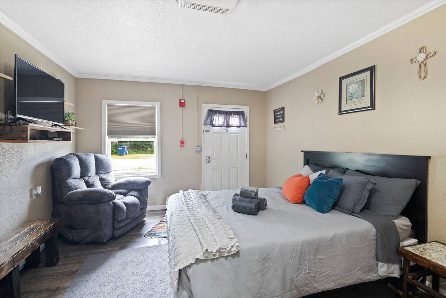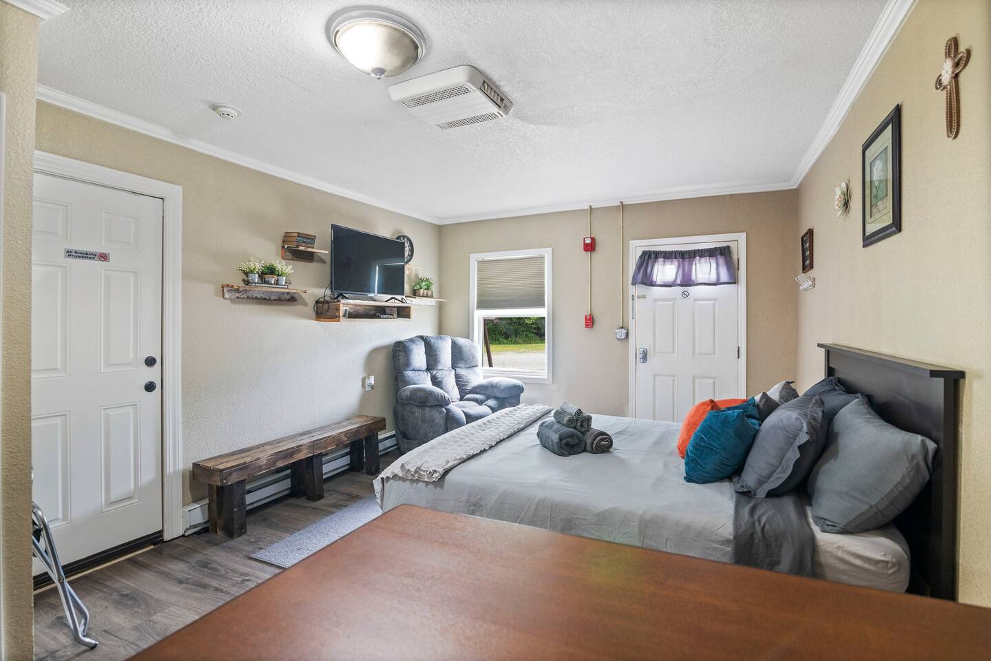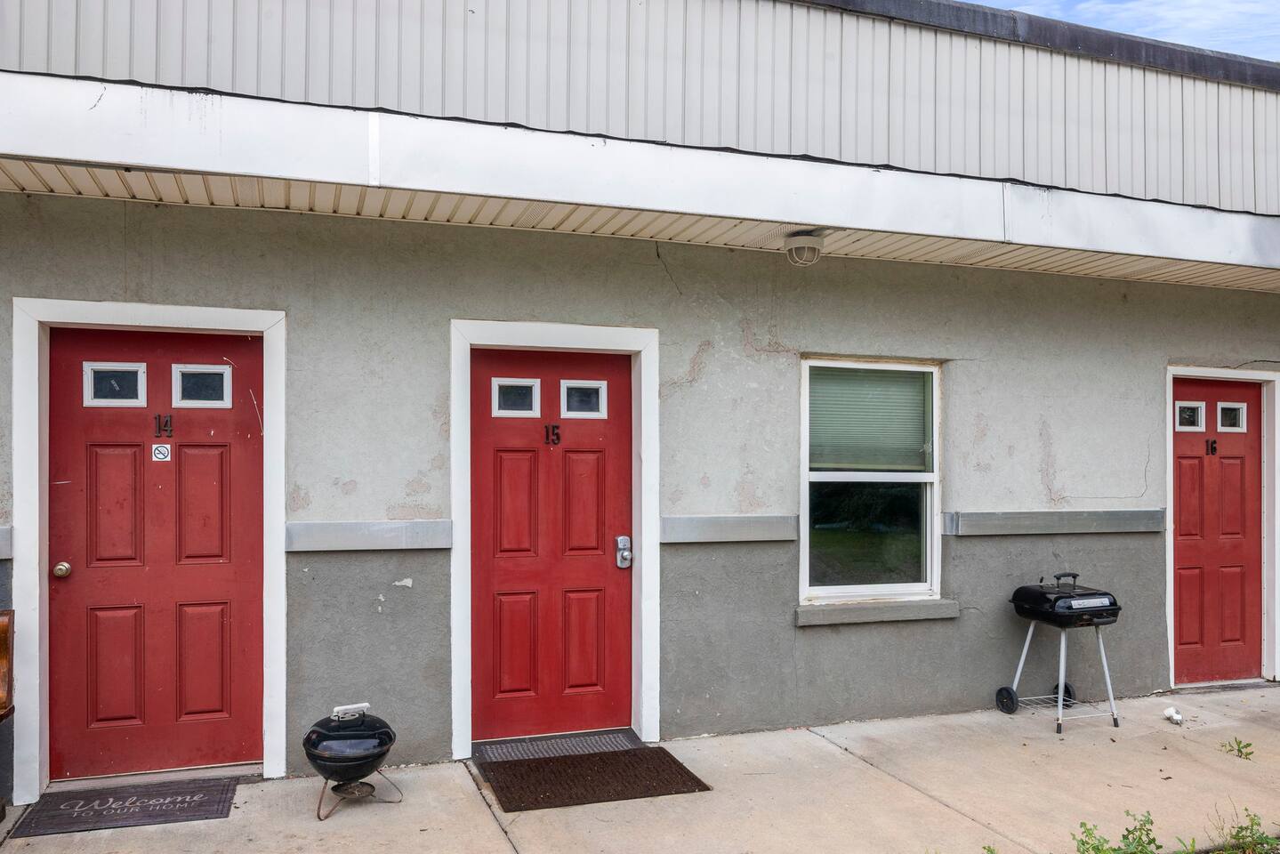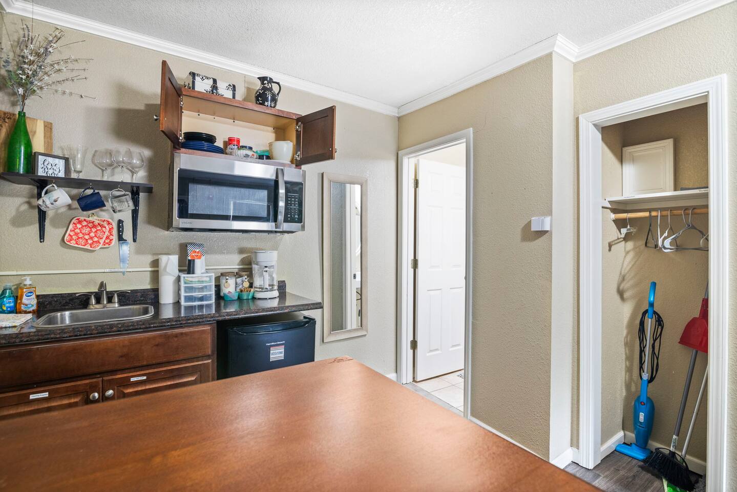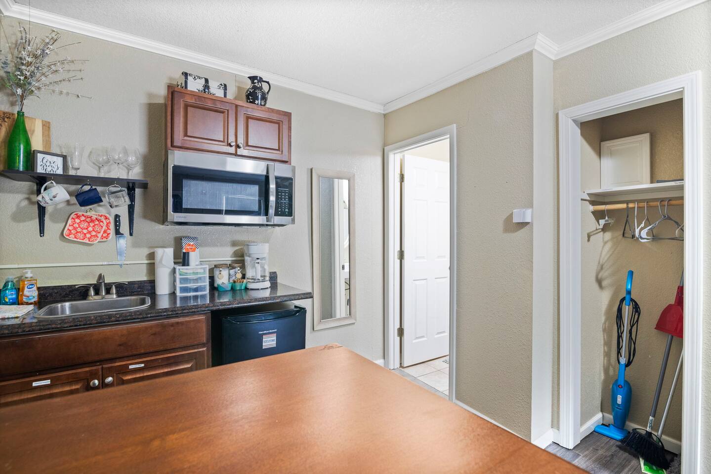The property was originally built and functioned as a motel. Rooms were then renovated and turned into individual apartments. This particular apartment is a studio room with a queen-size bed, dining area, kitchenette, closet, and bathroom with a shower. There is a door that leads to the next room, but it is locked on both sides. The parking area and front door entrance has good lighting. The distance from where you park to where you stay is just a few feet away, and there are no stairs to go up, so it is very accessible. If you have things that need washed, there is a laundromat just a couple blocks away. If you are wanting somewhere to dine, there are several nearby restaurants, including a really good Mexican restaurant across the street.