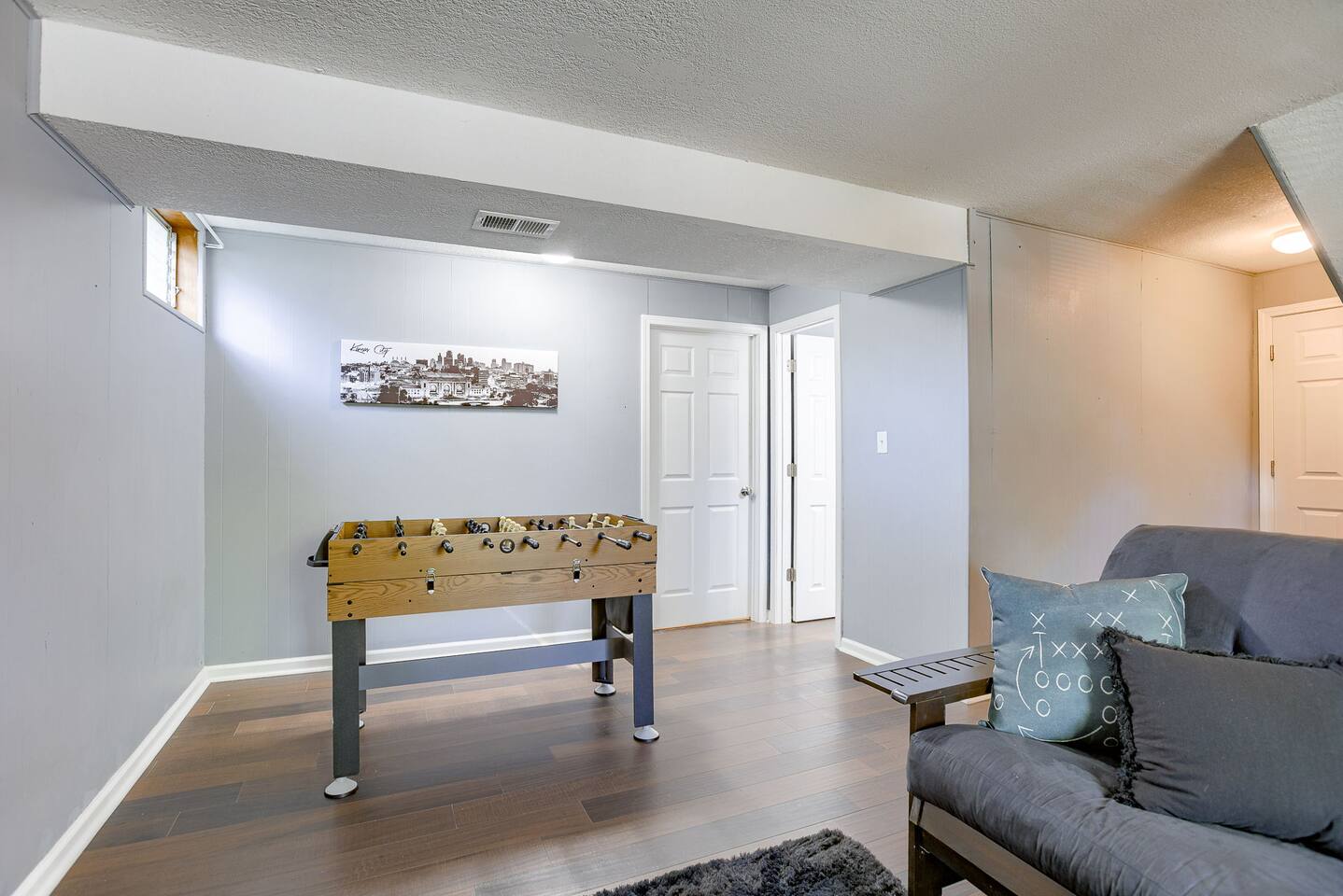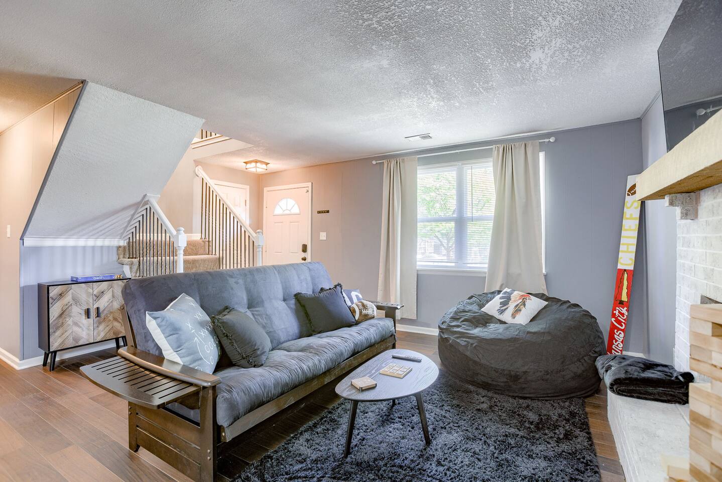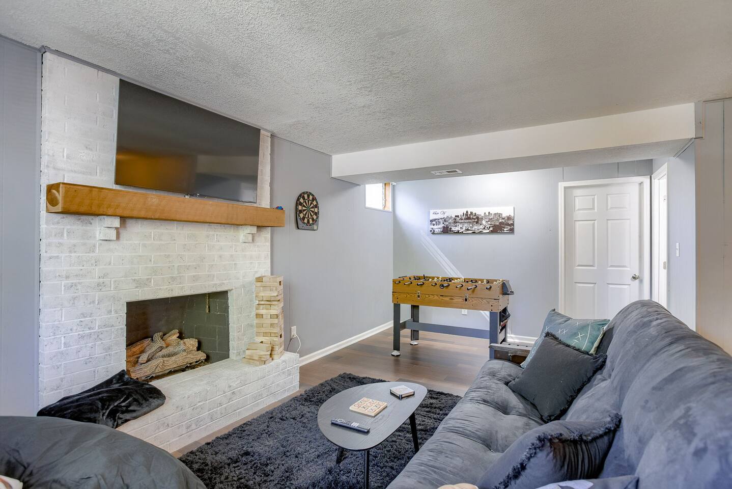 This beautifully designed split-level home is perfect for families or groups looking for both relaxation and entertainment. It features three spacious bedrooms, each furnished with cozy queen-sized beds. The game room in the basement is a highlight, offering foosball, darts, and arcade games, along with a futon that sleeps two extra guests. This versatile space is ideal for fun evenings indoors. The living room centers around a decorative fireplace, creating a warm and inviting atmosphere, while the dining area comfortably seats eight guests—great for group meals. The fully equipped kitchen makes it easy to cook up your favorite dishes, adding convenience to your stay. Step outside to the large patio area in the backyard, perfect for evening resting or simply unwinding in the fresh air. Our backyard is fully fenced. Additional amenities include a washer and dryer, ensuring longer stays are hassle-free. With 1.5 bathrooms, there’s enough space for everyone to refresh, and the 2-car garage, along with a wide driveway, provides ample parking for your group. Whether you’re here for a relaxing vacation, a business trip, or a family gathering, this home provides everything you need for a memorable stay. Nearby: St Mary's hospital: 7 min Centerpoint Medical Center: 10 min University Health Lakewood: 16 min St. Luke’s East: 17min Kanas City Cheifs & Royals stadiums: 18min Missouri Town Living History Museum :17 min Jackson County Parks + Rec: 8 min Book your stay now!