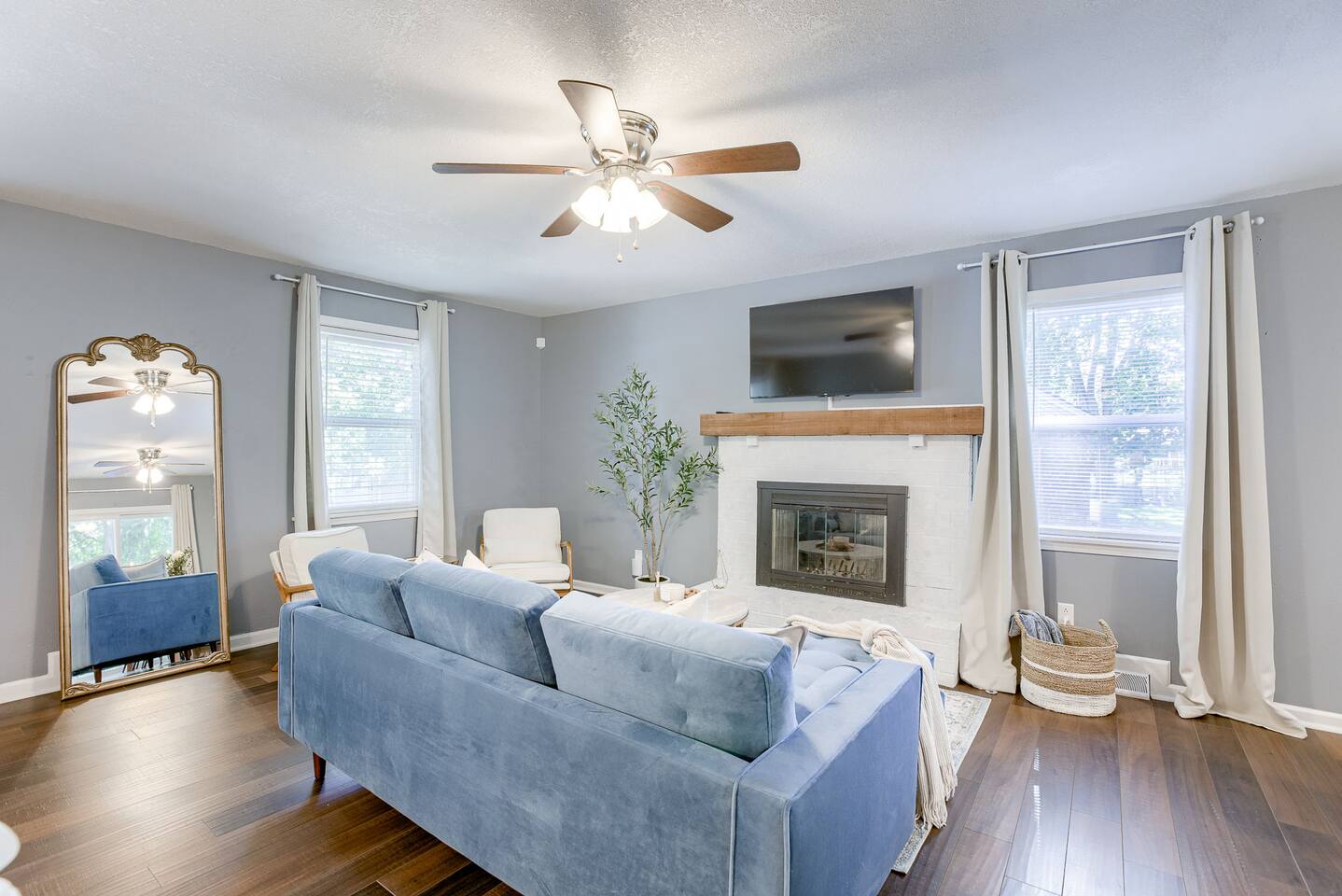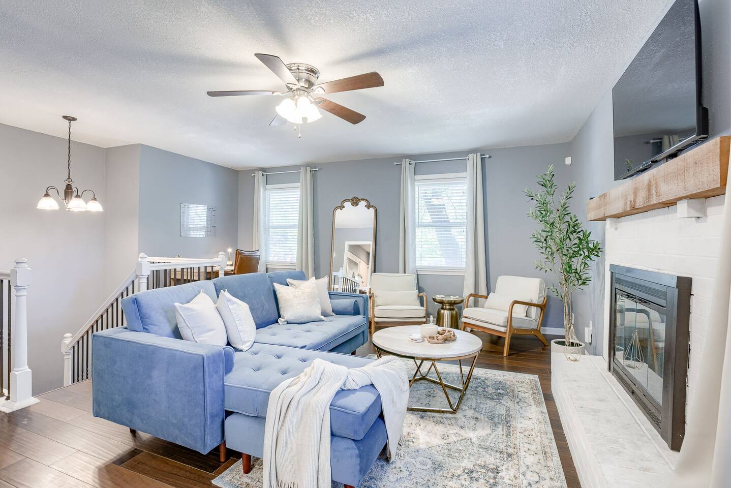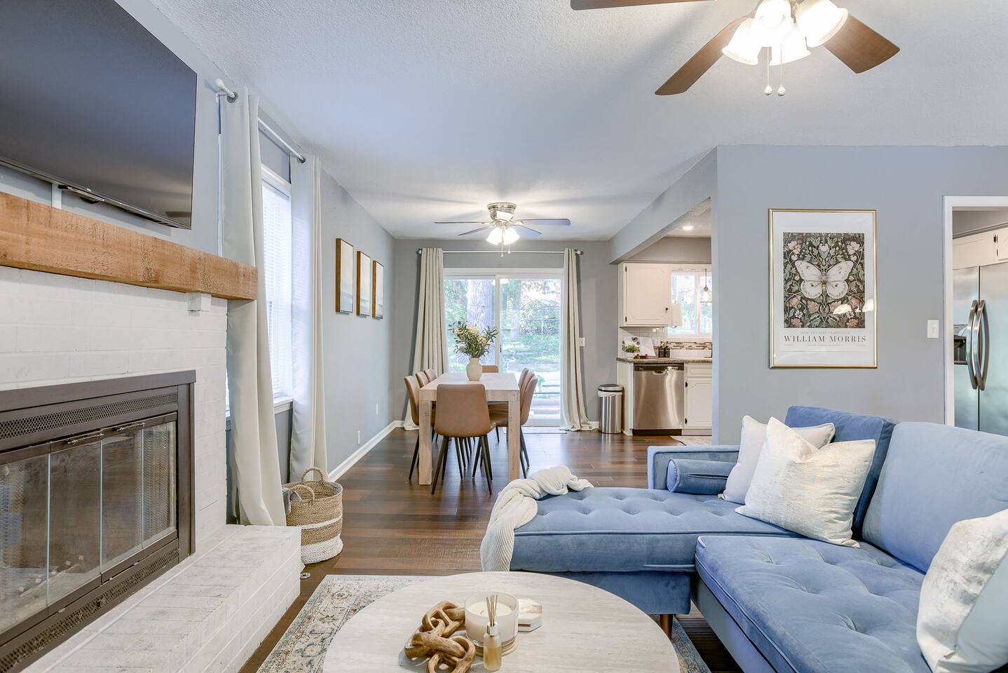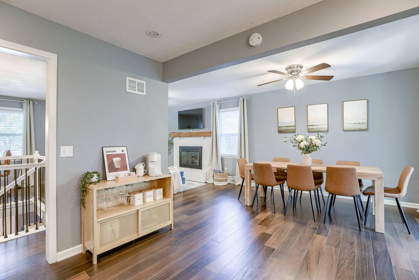 This beautifully designed split-level home is perfect for families or groups looking for both relaxation and entertainment. It features three spacious bedrooms, each furnished with cozy queen-sized beds. The game room in the basement is a highlight, offering foosball, darts, and arcade games, along with a futon that sleeps two extra guests. This versatile space is ideal for fun evenings indoors. The living room centers around a decorative fireplace, creating a warm and inviting atmosphere, while the dining area comfortably seats eight guests—great for group meals. The fully equipped kitchen makes it easy to cook up your favorite dishes, adding convenience to your stay. Step outside to the large patio area in the backyard, perfect for evening resting or simply unwinding in the fresh air. Our backyard is fully fenced. Additional amenities include a washer and dryer, ensuring longer stays are hassle-free. With 1.5 bathrooms, there’s enough space for everyone to refresh, and the 2-car garage, along with a wide driveway, provides ample parking for your group. Whether you’re here for a relaxing vacation, a business trip, or a family gathering, this home provides everything you need for a memorable stay. Nearby: St Mary's hospital: 7 min Centerpoint Medical Center: 10 min University Health Lakewood: 16 min St. Luke’s East: 17min Kanas City Cheifs & Royals stadiums: 18min Missouri Town Living History Museum :17 min Jackson County Parks + Rec: 8 min Book your stay now!
