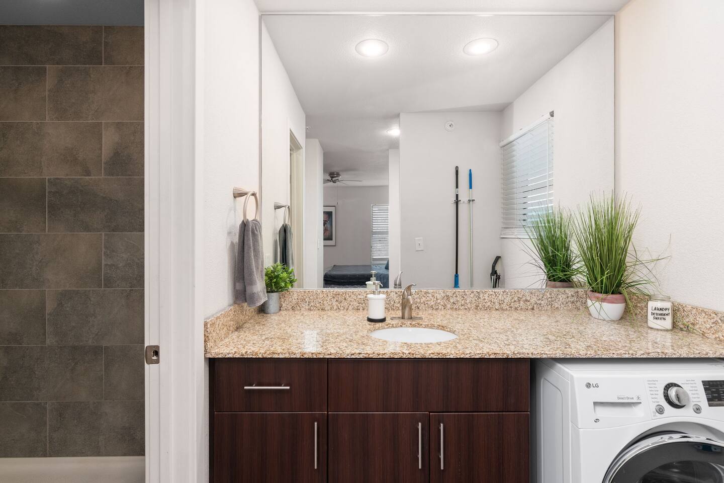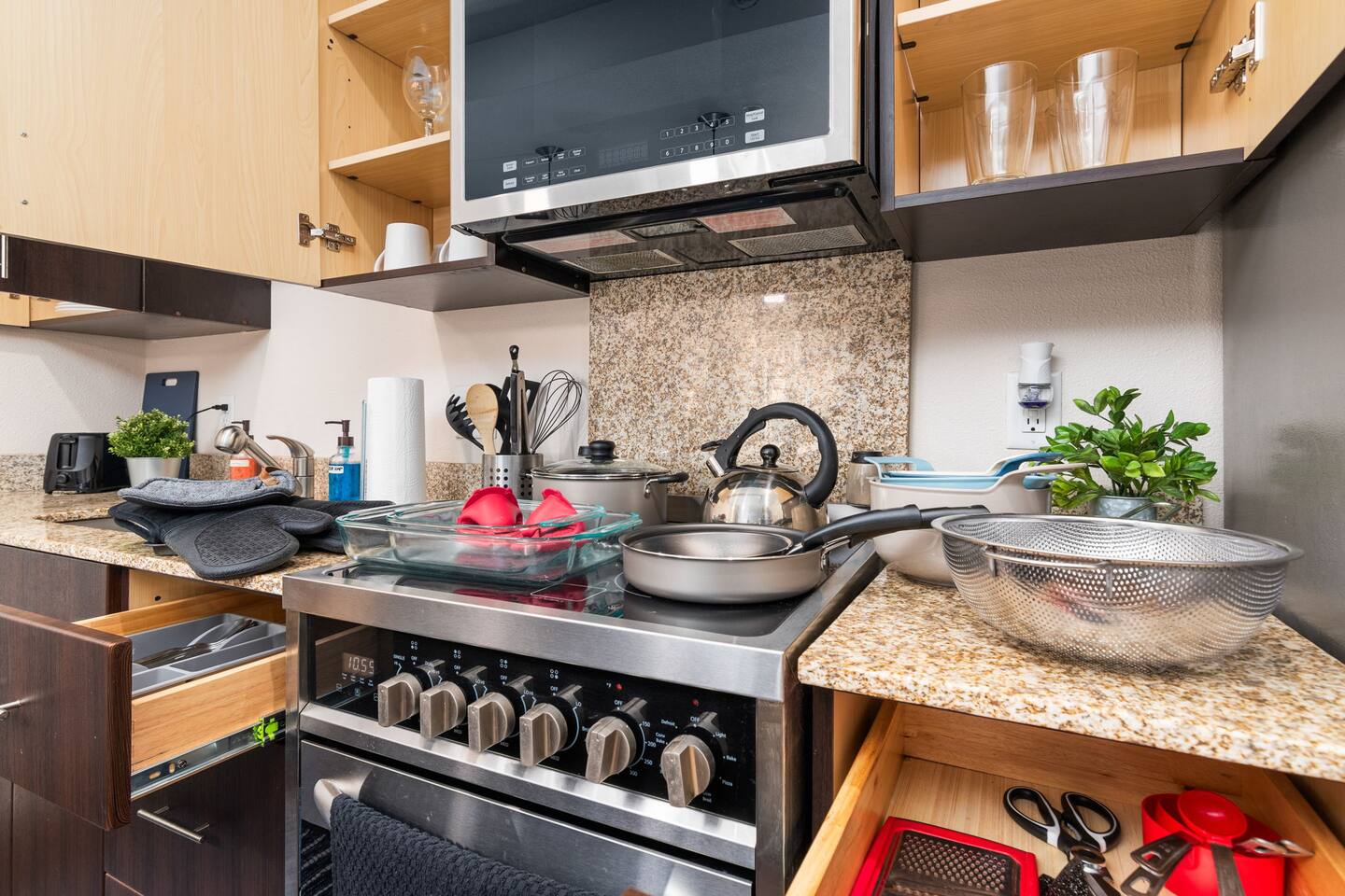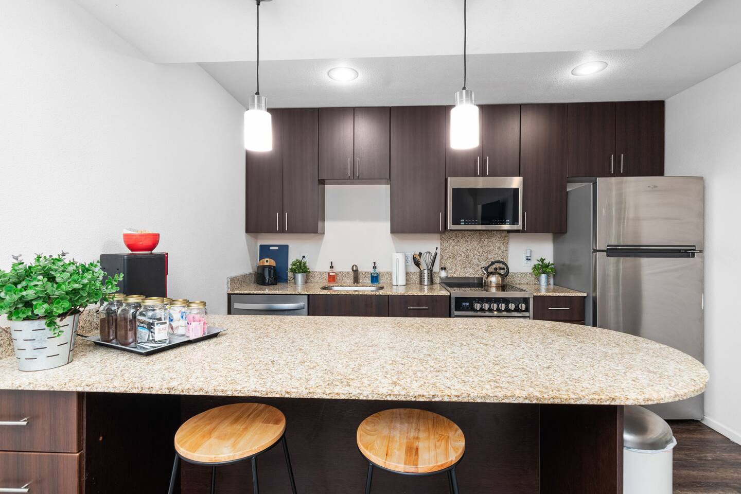 Key Features: ✔Bedroom: Unwind in the tranquil ambiance of the spacious bedroom, furnished with a plush king-sized bed, offering a peaceful night's sleep after a day of exploring the city. ✔Living Area: The inviting open concept living area is adorned with modern decor and ample natural light, creating a warm and welcoming atmosphere. ✔Relax on the comfortable couch which doubles as a queen-sized sleeper sofa, accommodating additional guests with ease. ✔Kitchen: Prepare delicious meals in the fully equipped kitchen featuring sleek countertops, stainless steel appliances, and essential cookware, making dining in a breeze. There is no dining table but the kitchen counter can accommodate up to 2 guests with 2 high chairs in it. ✔Bathroom: Refresh and rejuvenate in the sleek bathroom boasting contemporary fixtures and a spacious shower, providing a luxurious experience. ✔Gym Access: Stay active during your stay with complimentary access to the on-site gym facilities, equipped with state-of-the-art exercise equipment for your convenience. ✔The size of this property is approximately 487-500 sq ft.