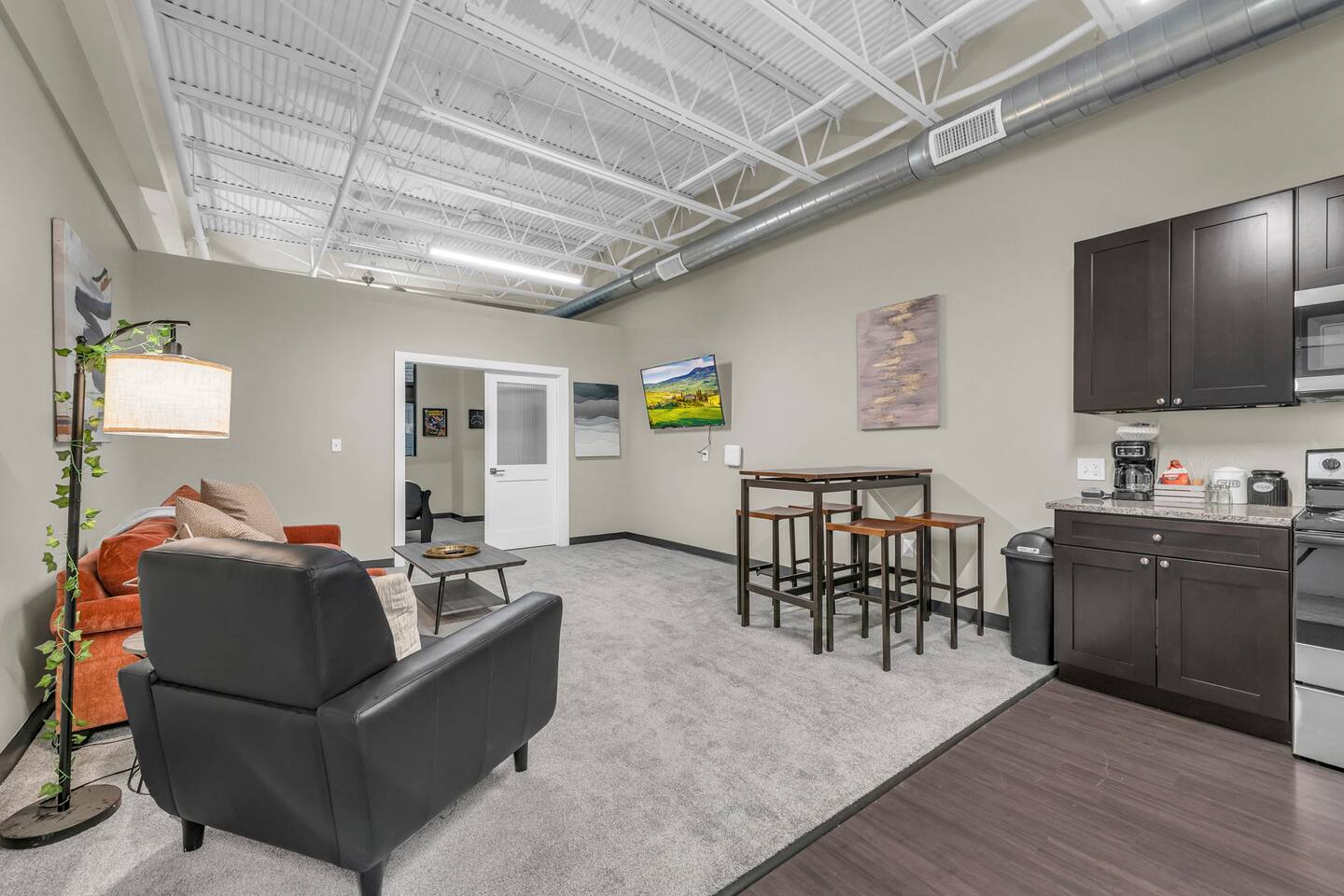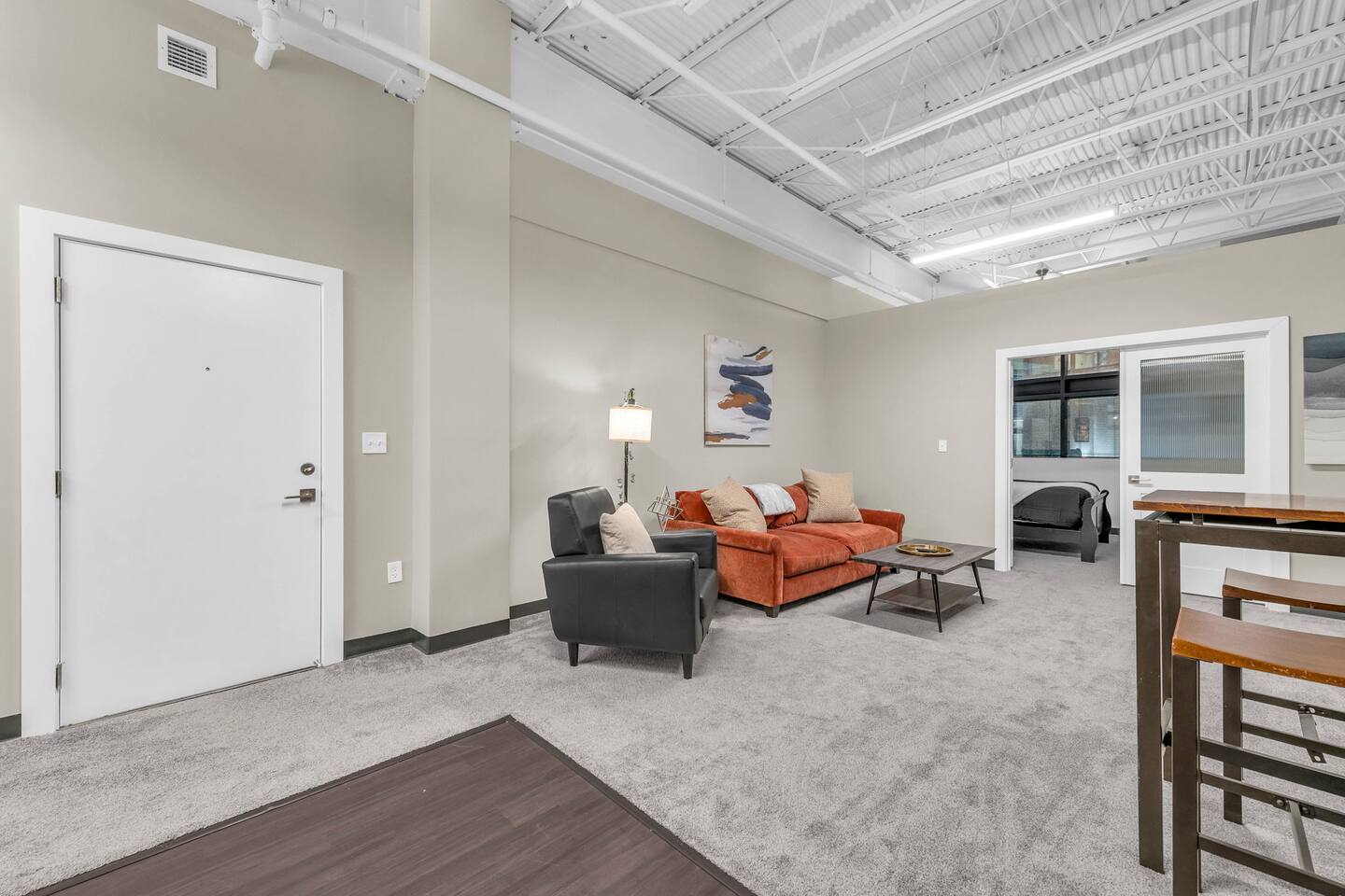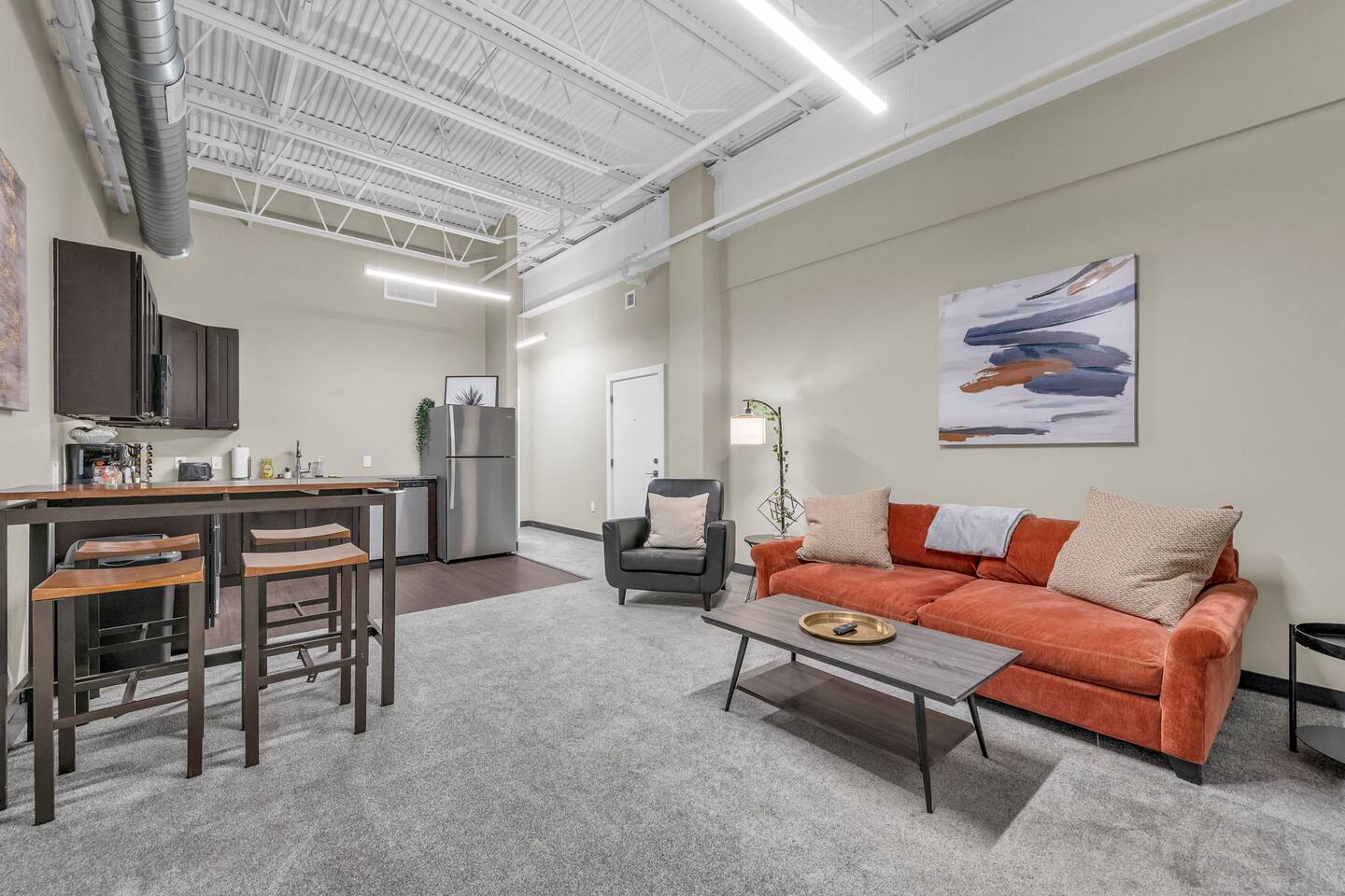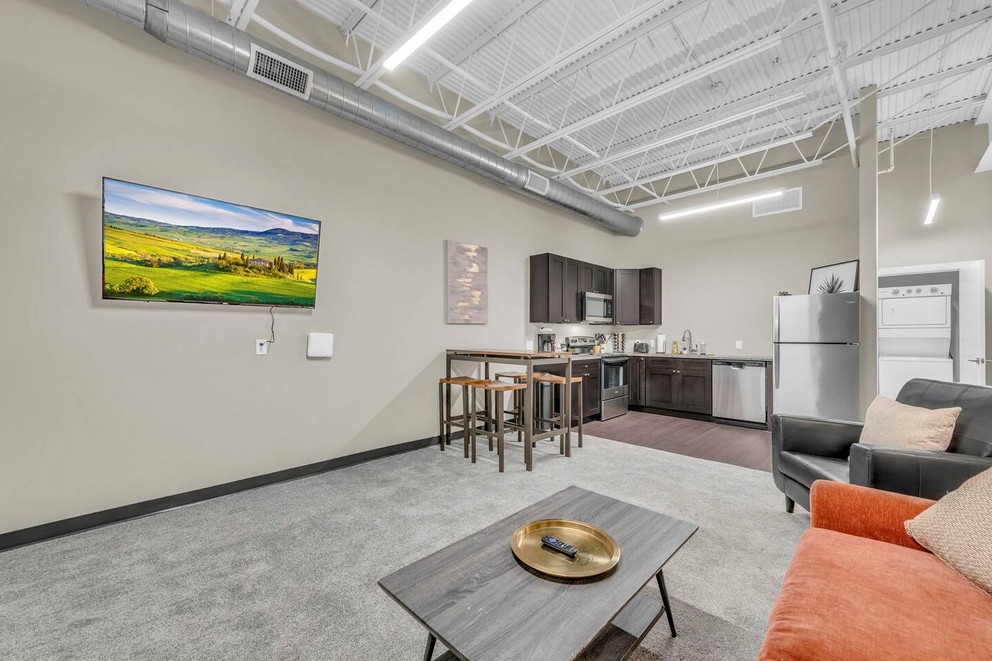 Welcome to our sleek, modern apartment, formerly an industrial building, just an 8-minute drive from MCI. This stylish one-bedroom apartment is perfect for two guests and offers all the amenities you need for a comfortable stay. The open-concept design seamlessly integrates the living room, kitchen, and dining area, creating a spacious and inviting atmosphere. The kitchen is fully equipped with everything you need to prepare meals, and the apartment features its own washer and dryer for your convenience. The full bathroom includes both a shower and a bathtub, providing options for relaxation and refreshment. The bedroom is furnished with a comfortable queen bed, ensuring a restful night's sleep. Experience the perfect blend of modern design and industrial charm in this beautifully appointed apartment, ideal for a short stay or an extended visit. Just a quick heads-up that the parking spots right in front of the property are reserved for loading, unloading, and for future residents. To keep things easy for everyone, please use the large parking lot instead.