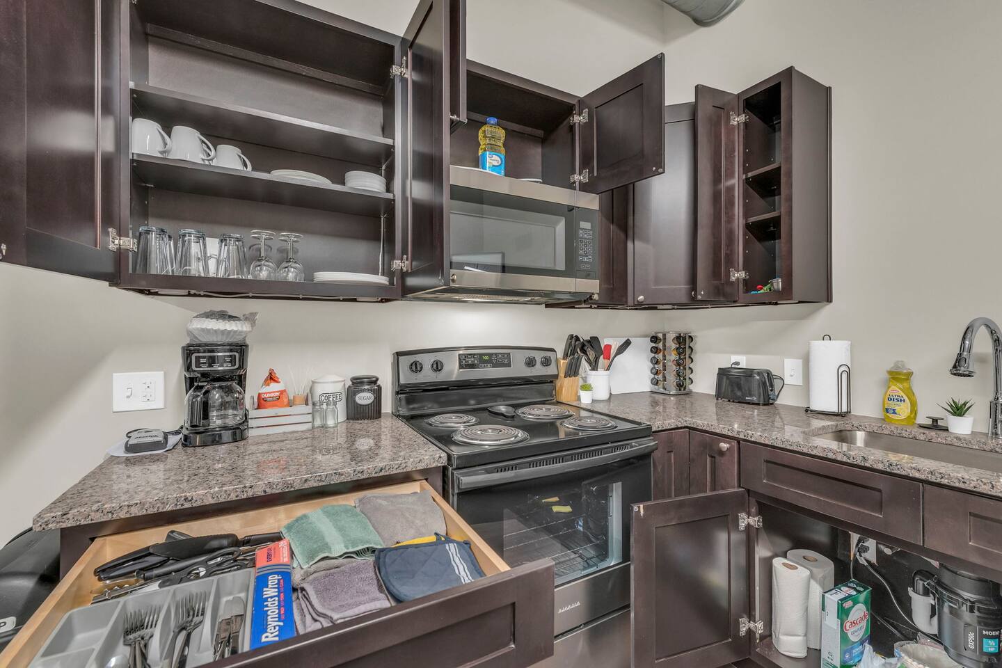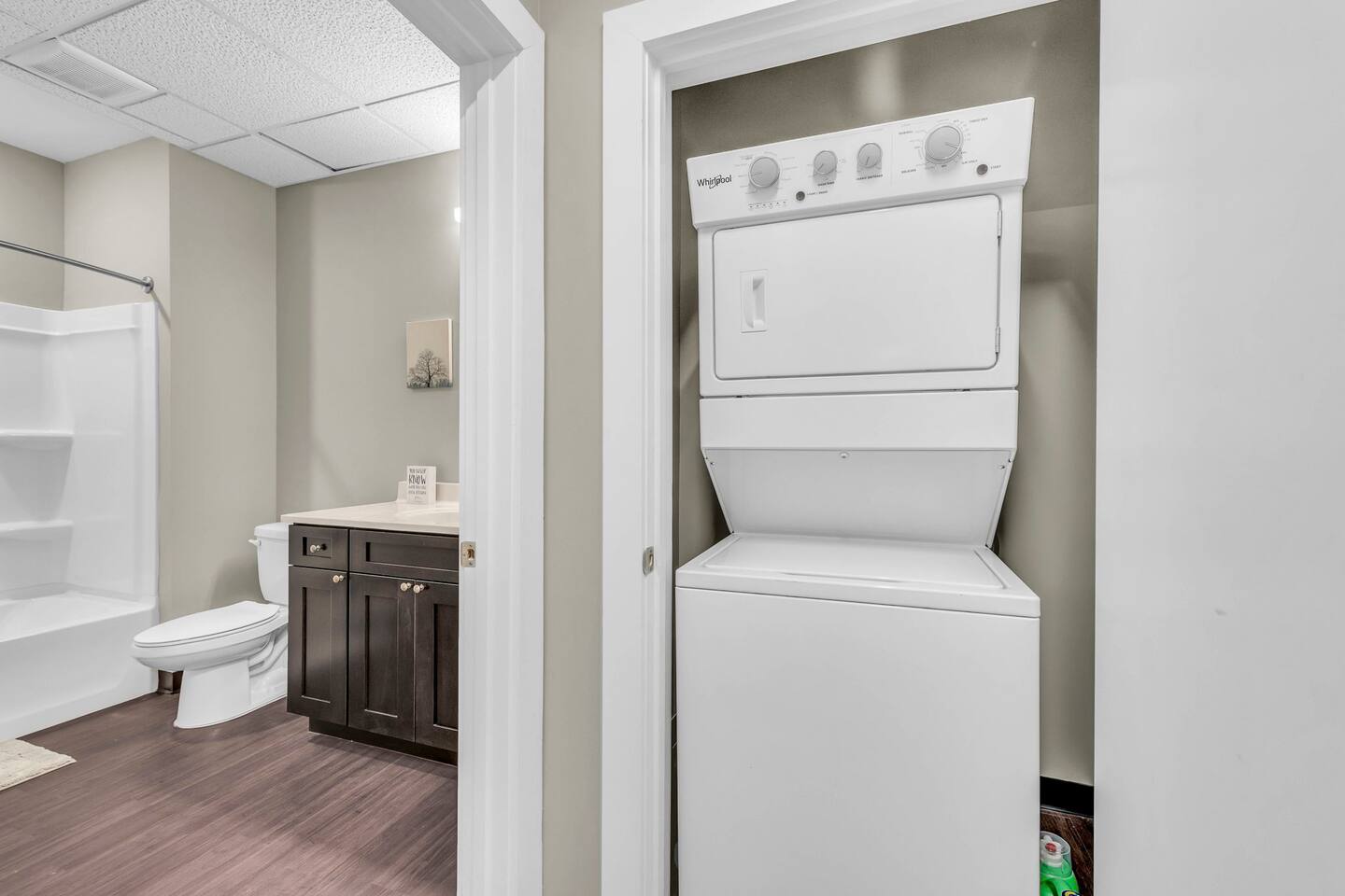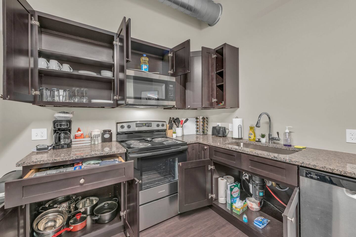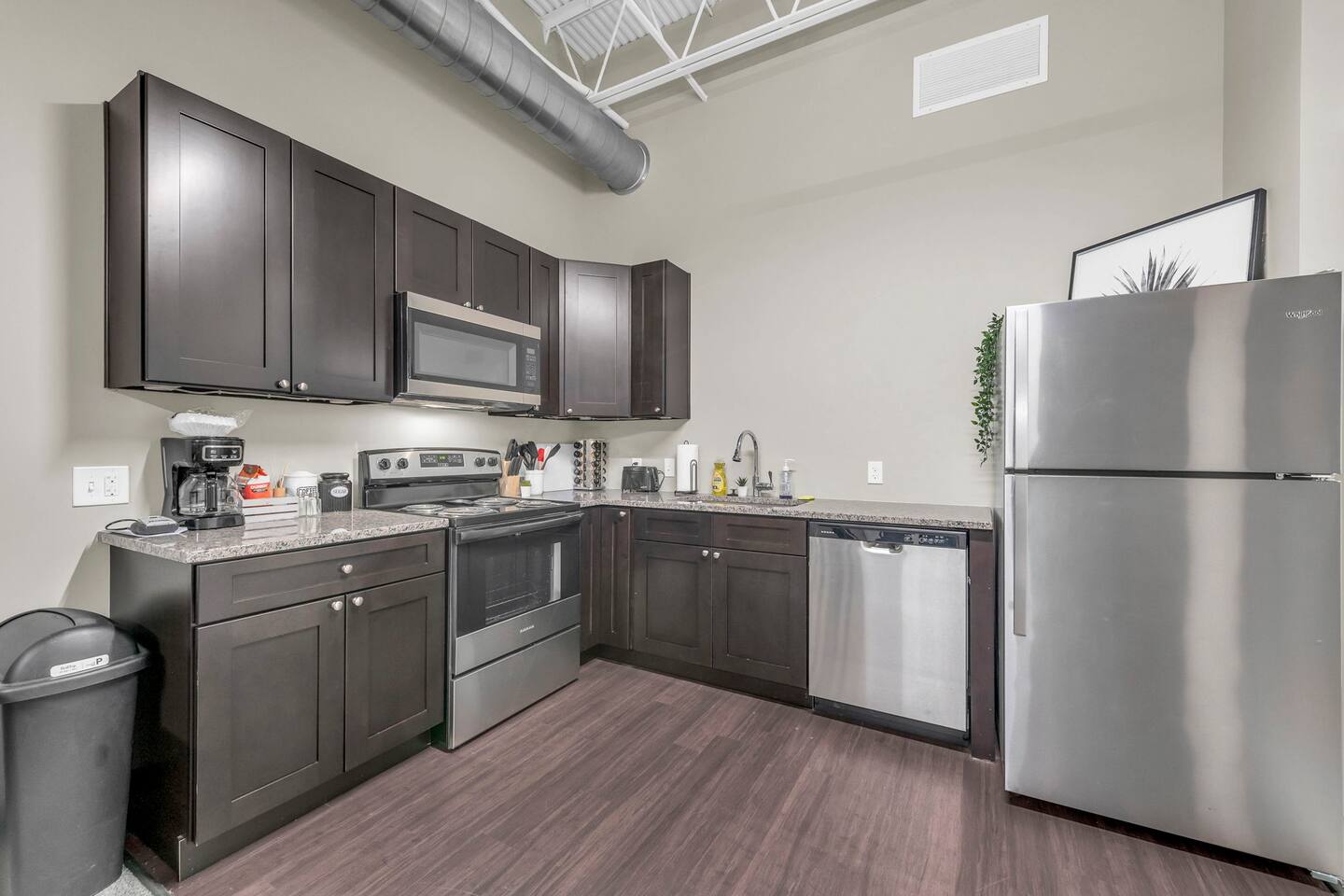 Welcome to our sleek, modern apartment, formerly an industrial building, just an 8-minute drive from MCI. This stylish one-bedroom apartment is perfect for two guests and offers all the amenities you need for a comfortable stay. The open-concept design seamlessly integrates the living room, kitchen, and dining area, creating a spacious and inviting atmosphere. The kitchen is fully equipped with everything you need to prepare meals, and the apartment features its own washer and dryer for your convenience. The full bathroom includes both a shower and a bathtub, providing options for relaxation and refreshment. The bedroom is furnished with a comfortable queen bed, ensuring a restful night's sleep. Experience the perfect blend of modern design and industrial charm in this beautifully appointed apartment, ideal for a short stay or an extended visit. Just a quick heads-up that the parking spots right in front of the property are reserved for loading, unloading, and for future residents. To keep things easy for everyone, please use the large parking lot instead.